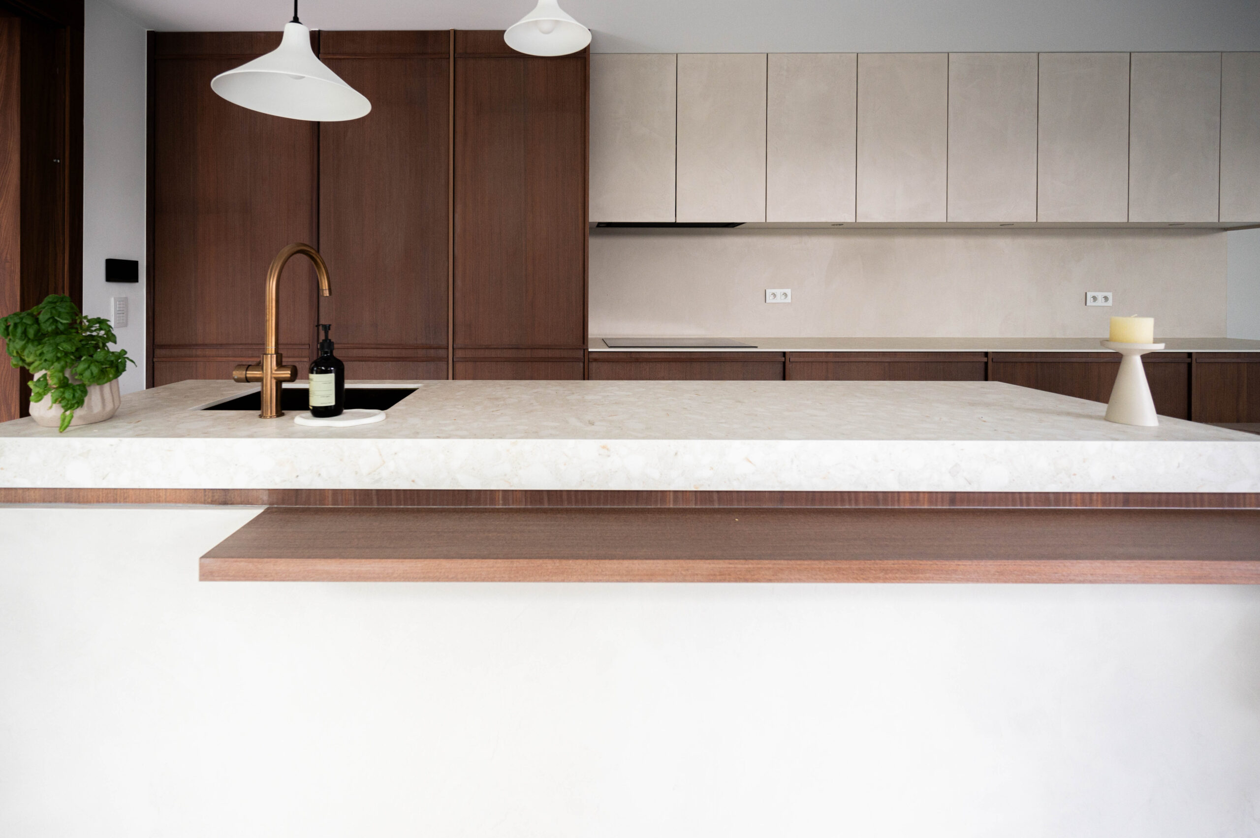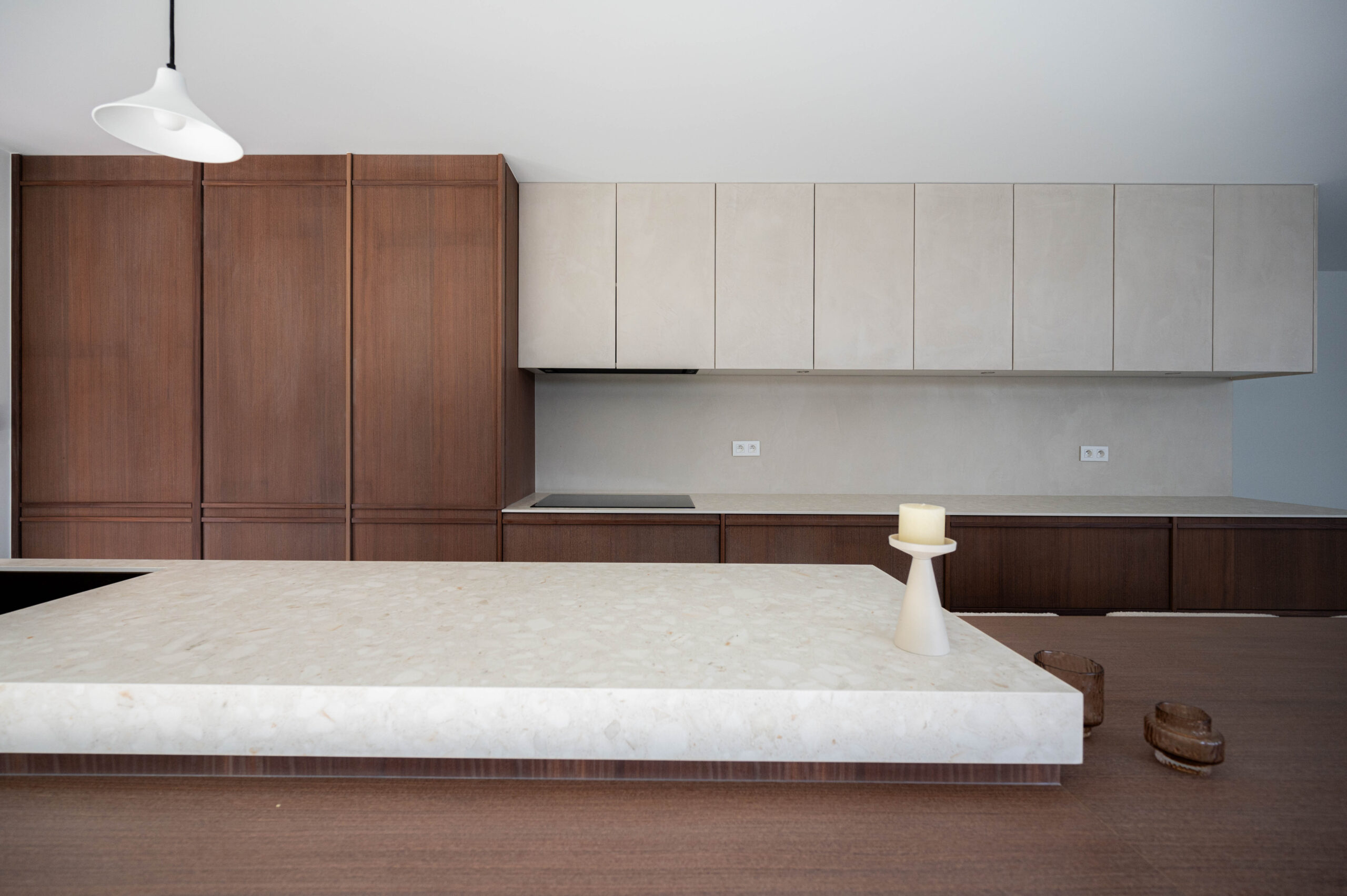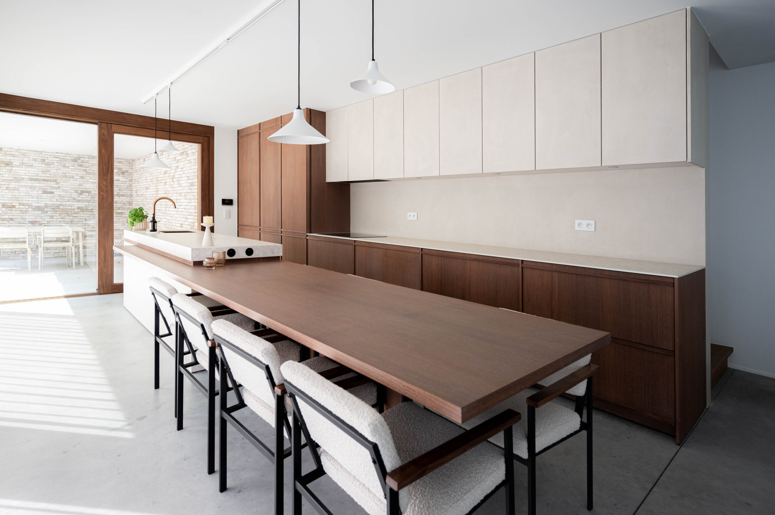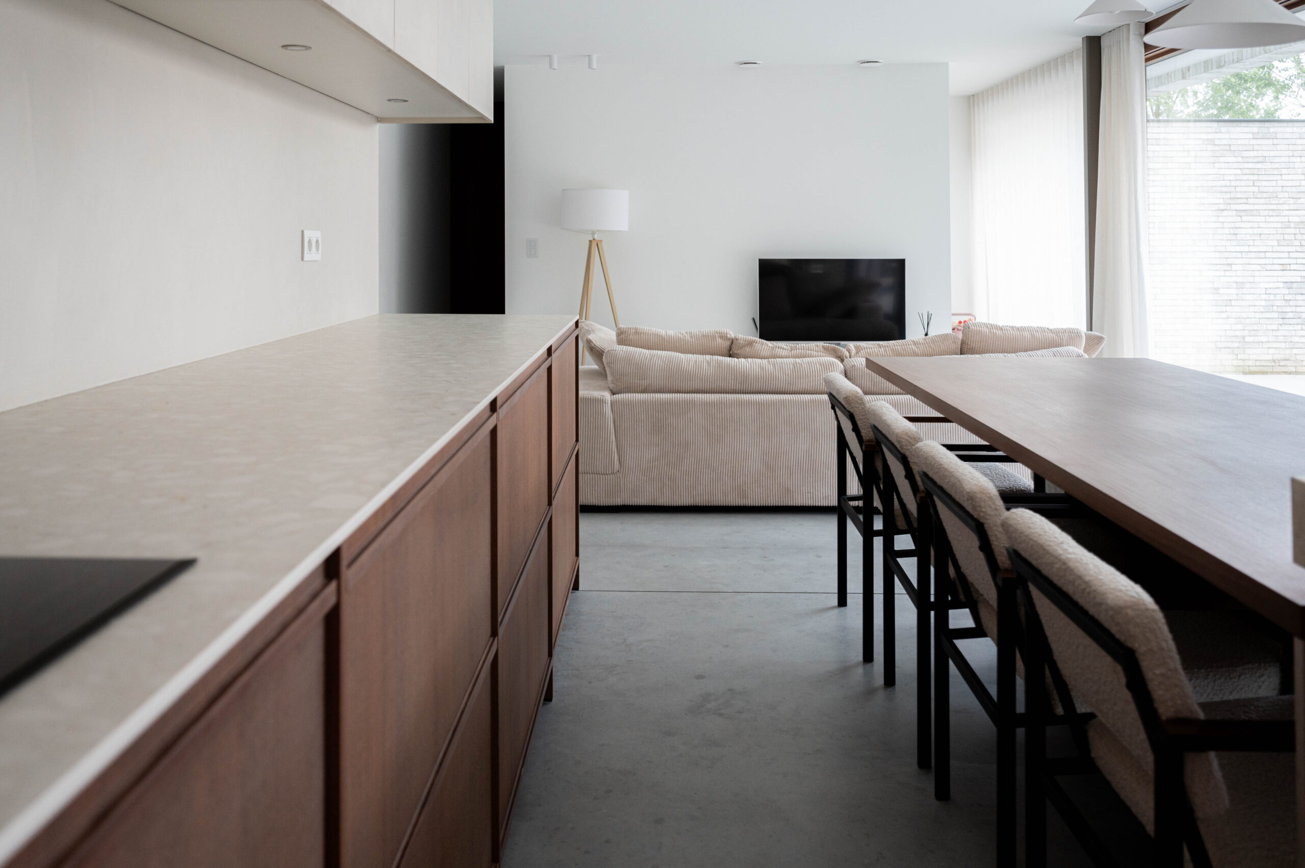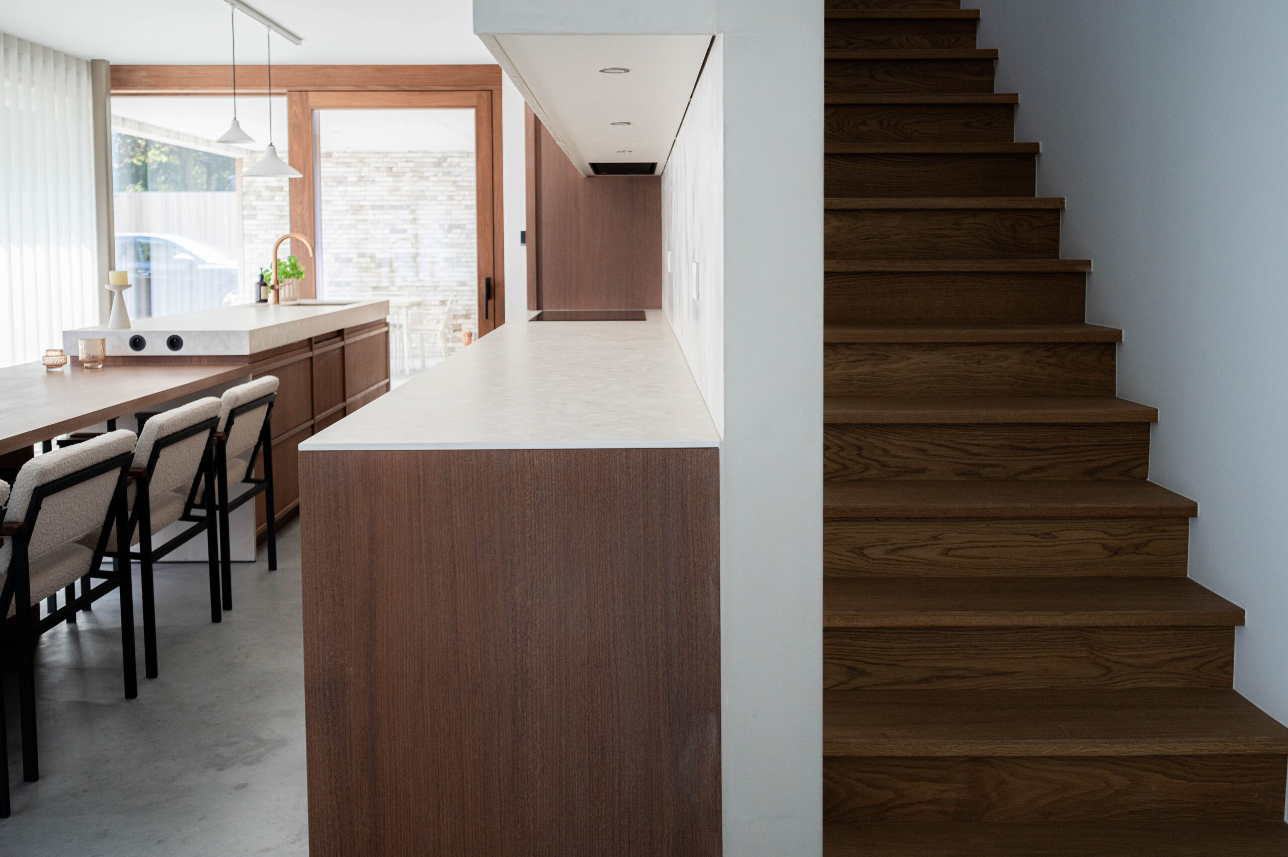 Als een architect vraagt om de keuken van zijn eigen nieuwbouwwoning te realiseren dan weet je al dat het ontwerp en de gekozen materialen “eens iets anders” zijn. We werkten met afrormosia fineer voor de fronten, in combinatie met massief houten grepen en de fronten van de hangkasten in beton ciré van Mineral deco. Het werkblad in keramiek “Retrostone” van Neolith.