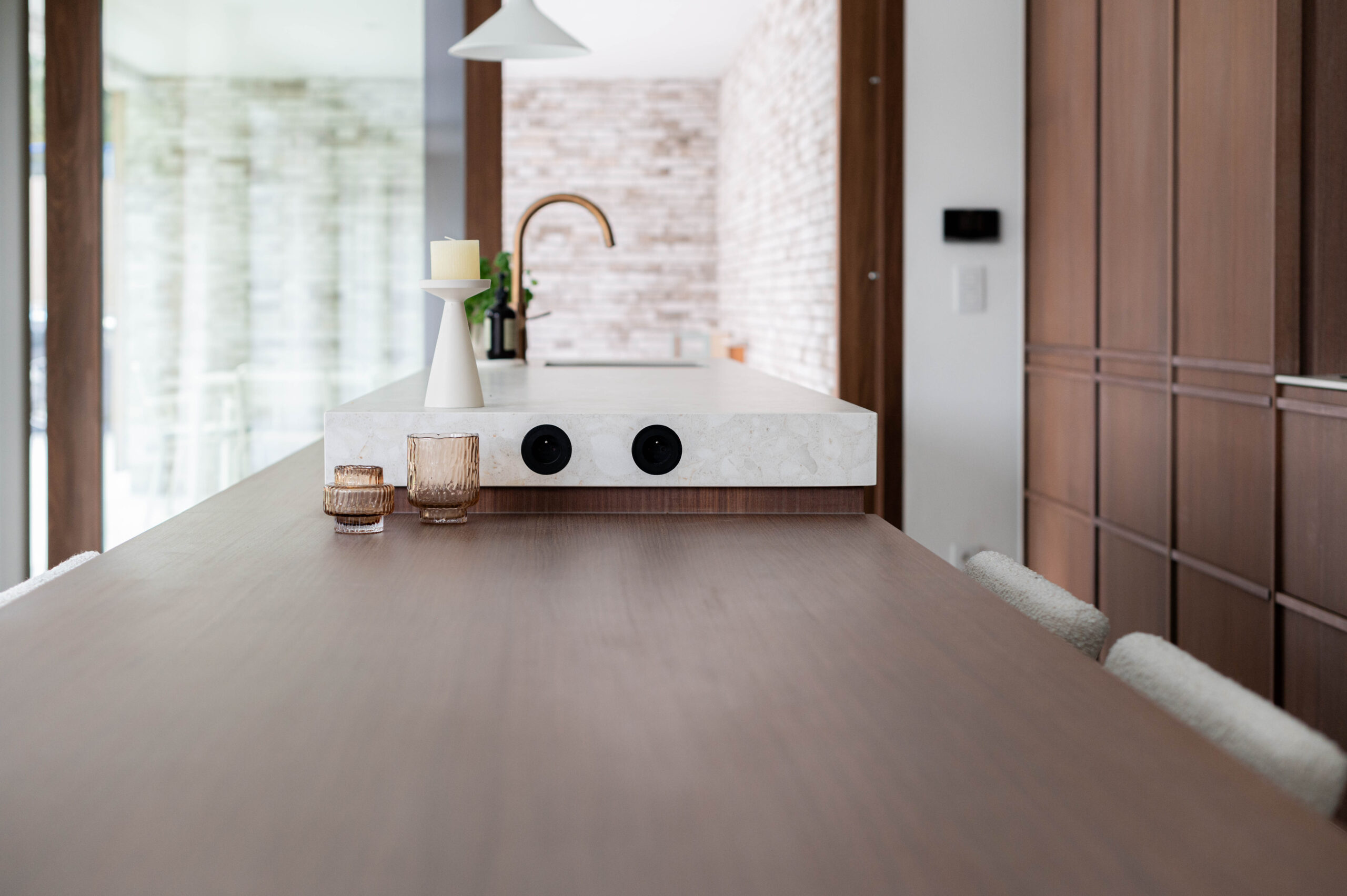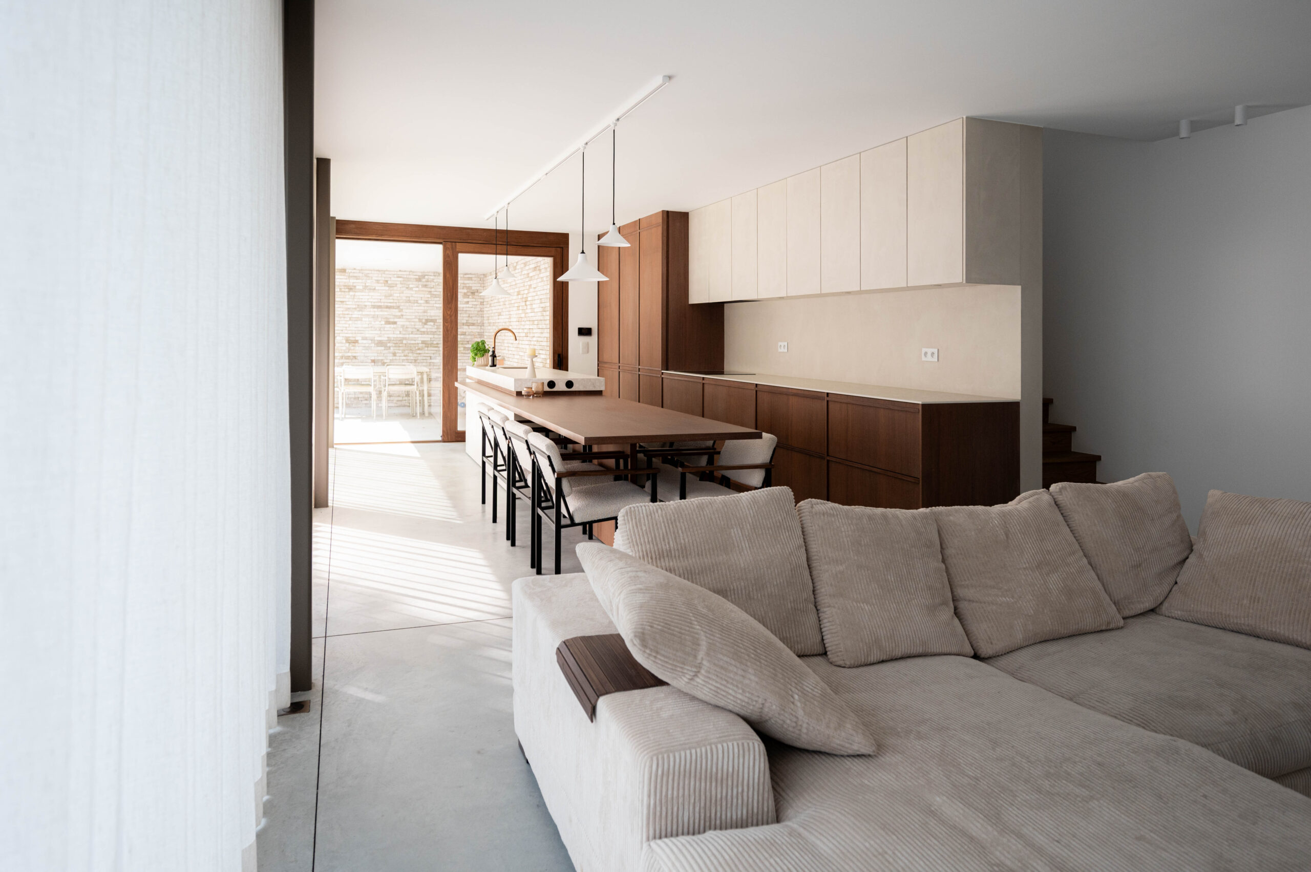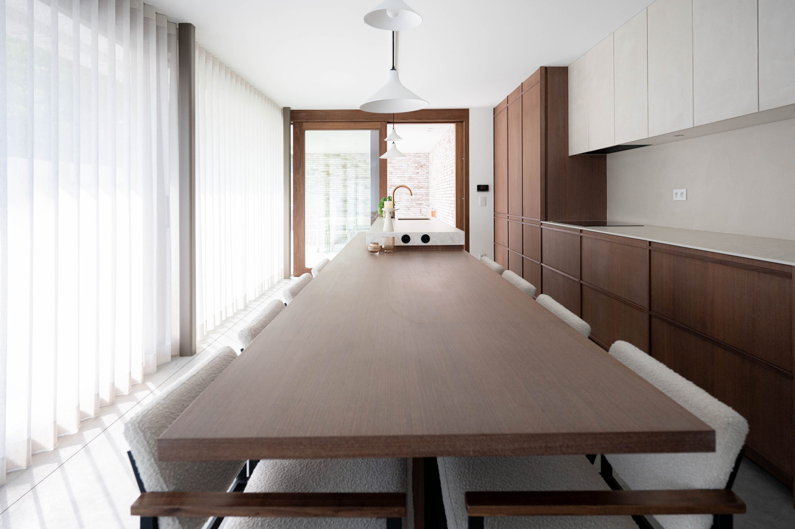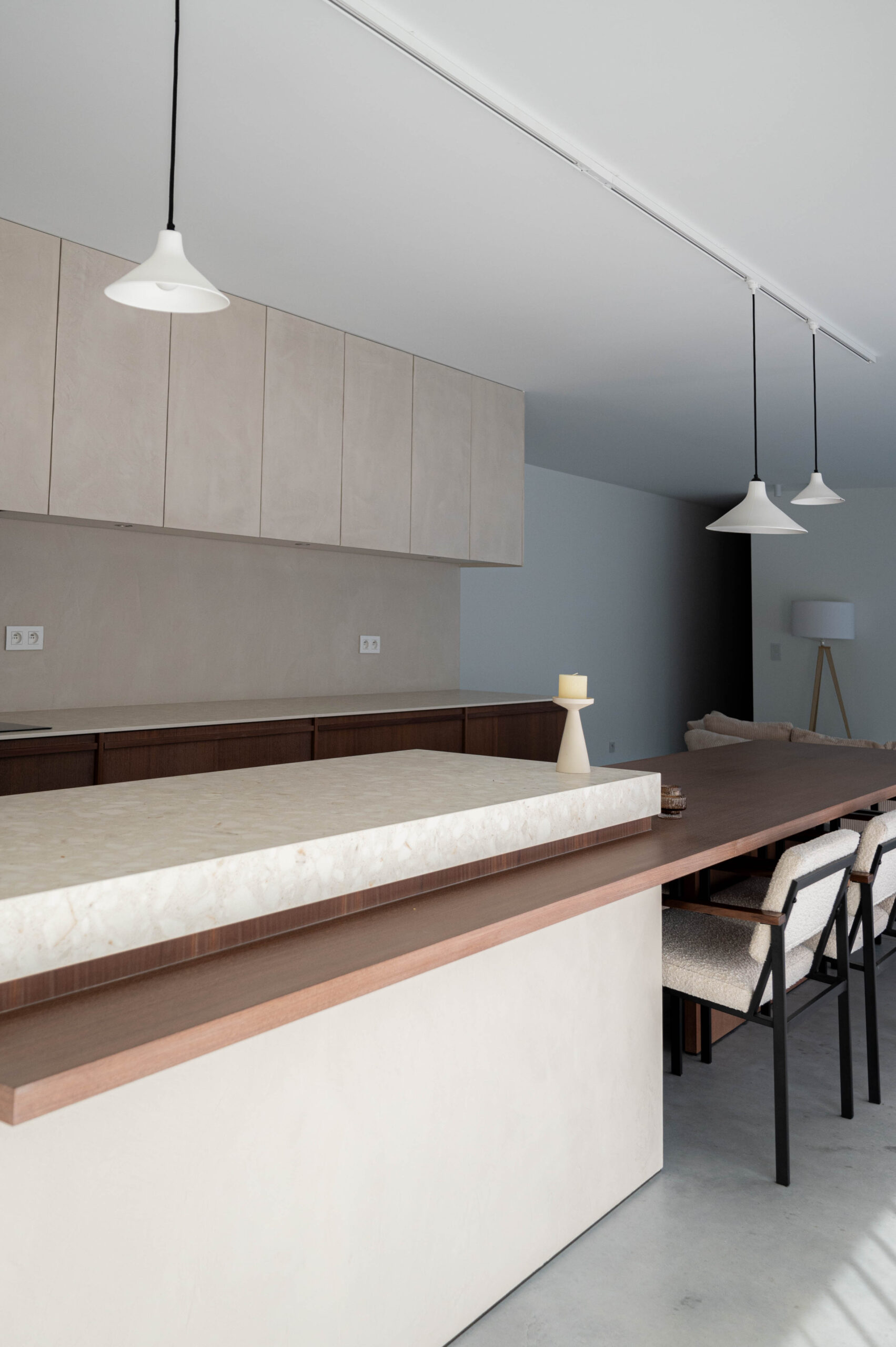 Als een architect vraagt om de keuken van zijn eigen nieuwbouwwoning te realiseren dan weet je al dat het ontwerp en de gekozen materialen “eens iets anders” zijn. We werkten met afrormosia fineer voor de fronten, in combinatie met massief houten grepen en de fronten van de hangkasten in beton ciré van Mineral deco. Het werkblad in keramiek “Retrostone” van Neolith.