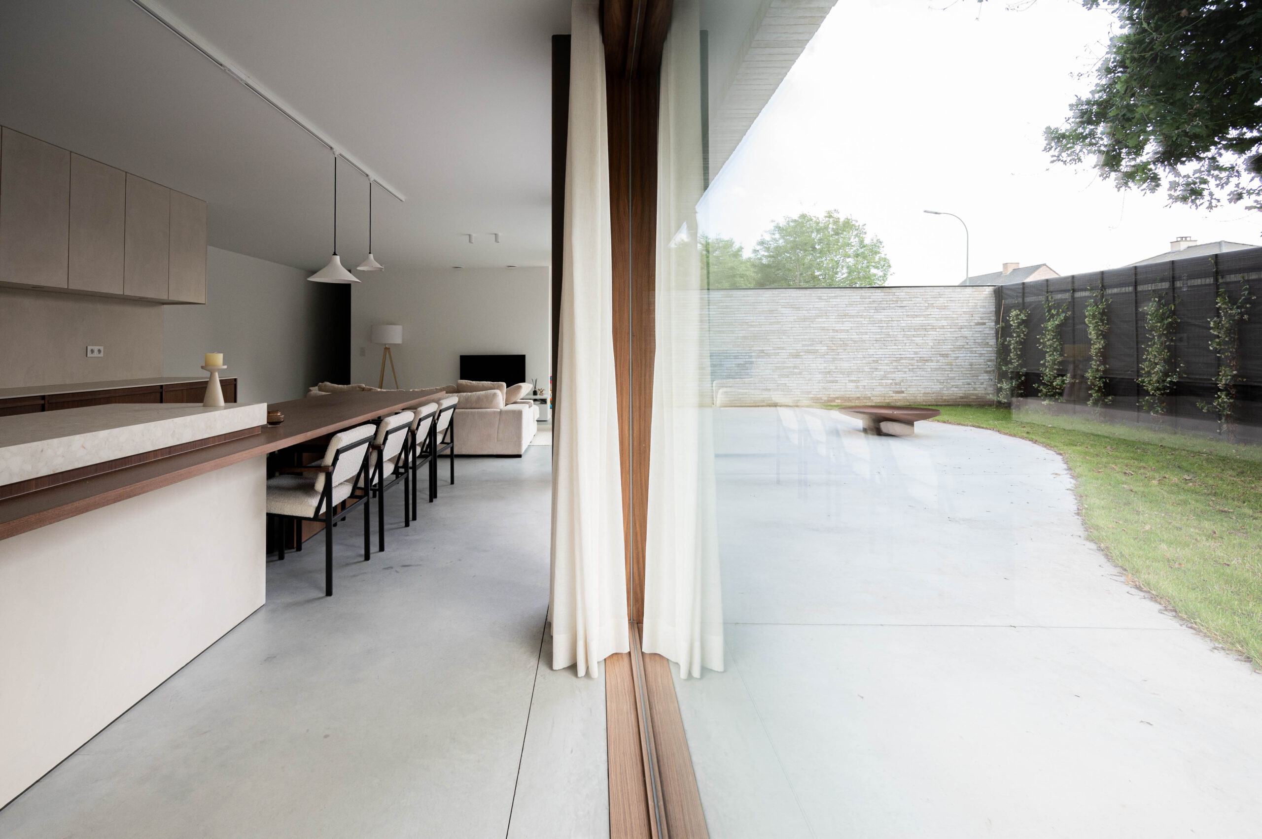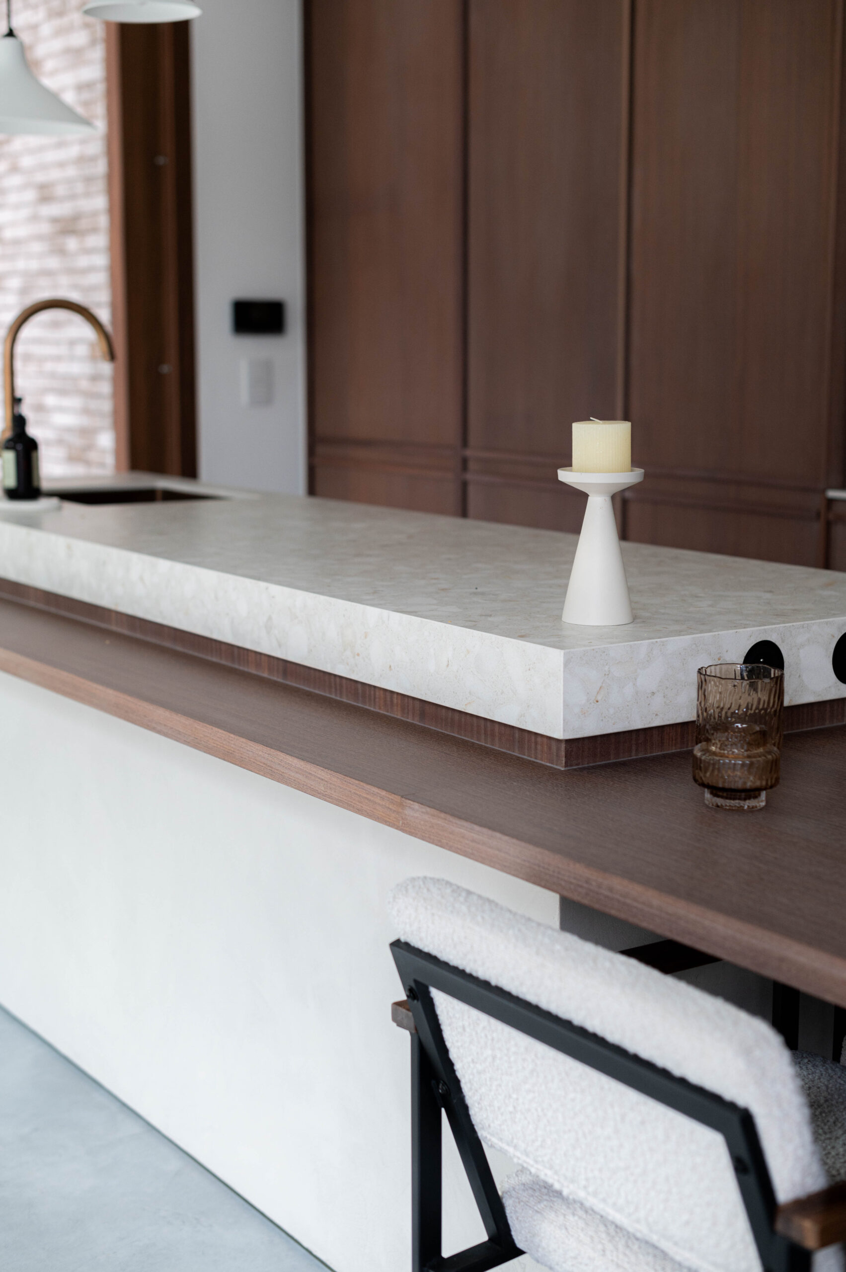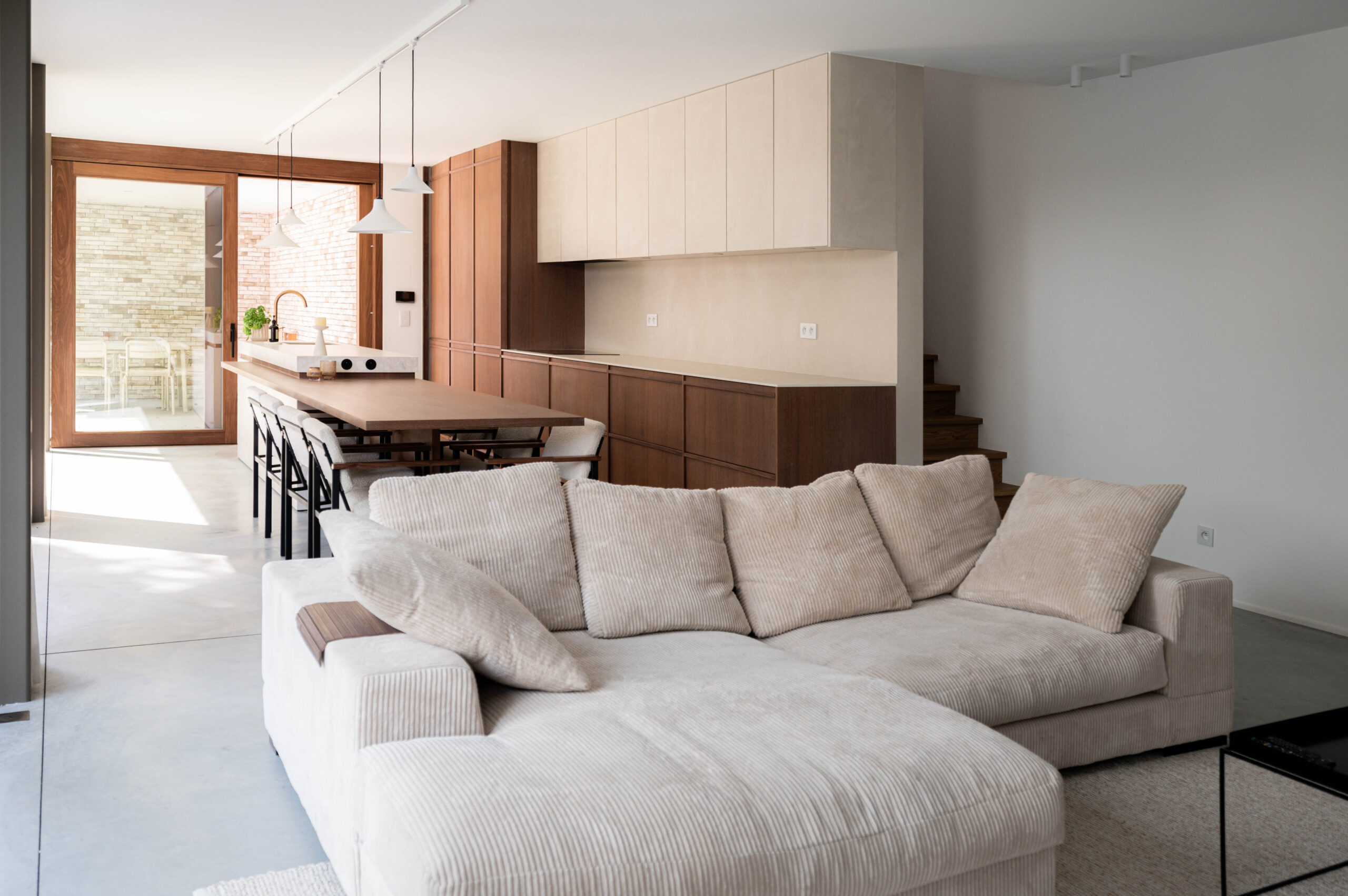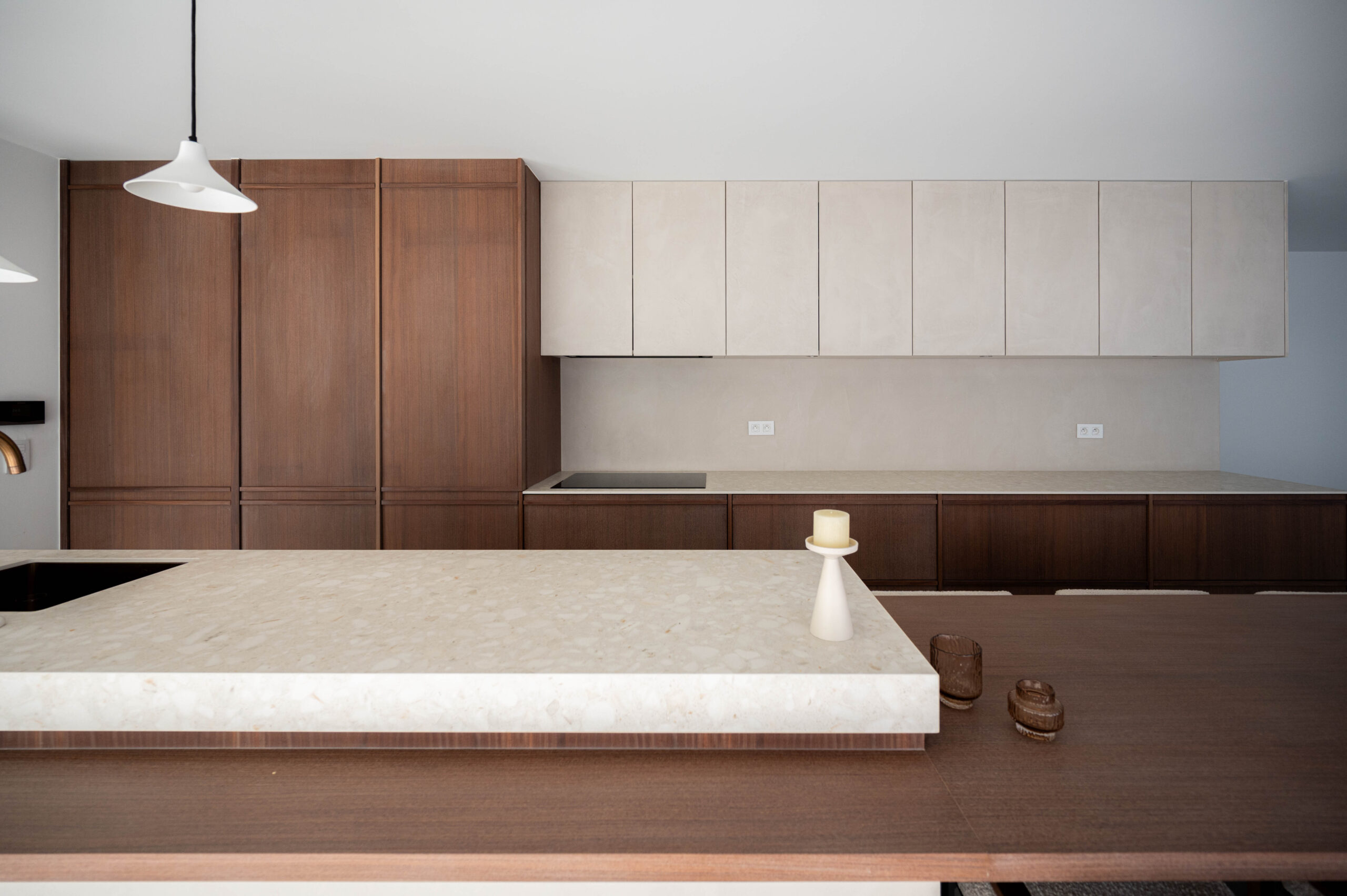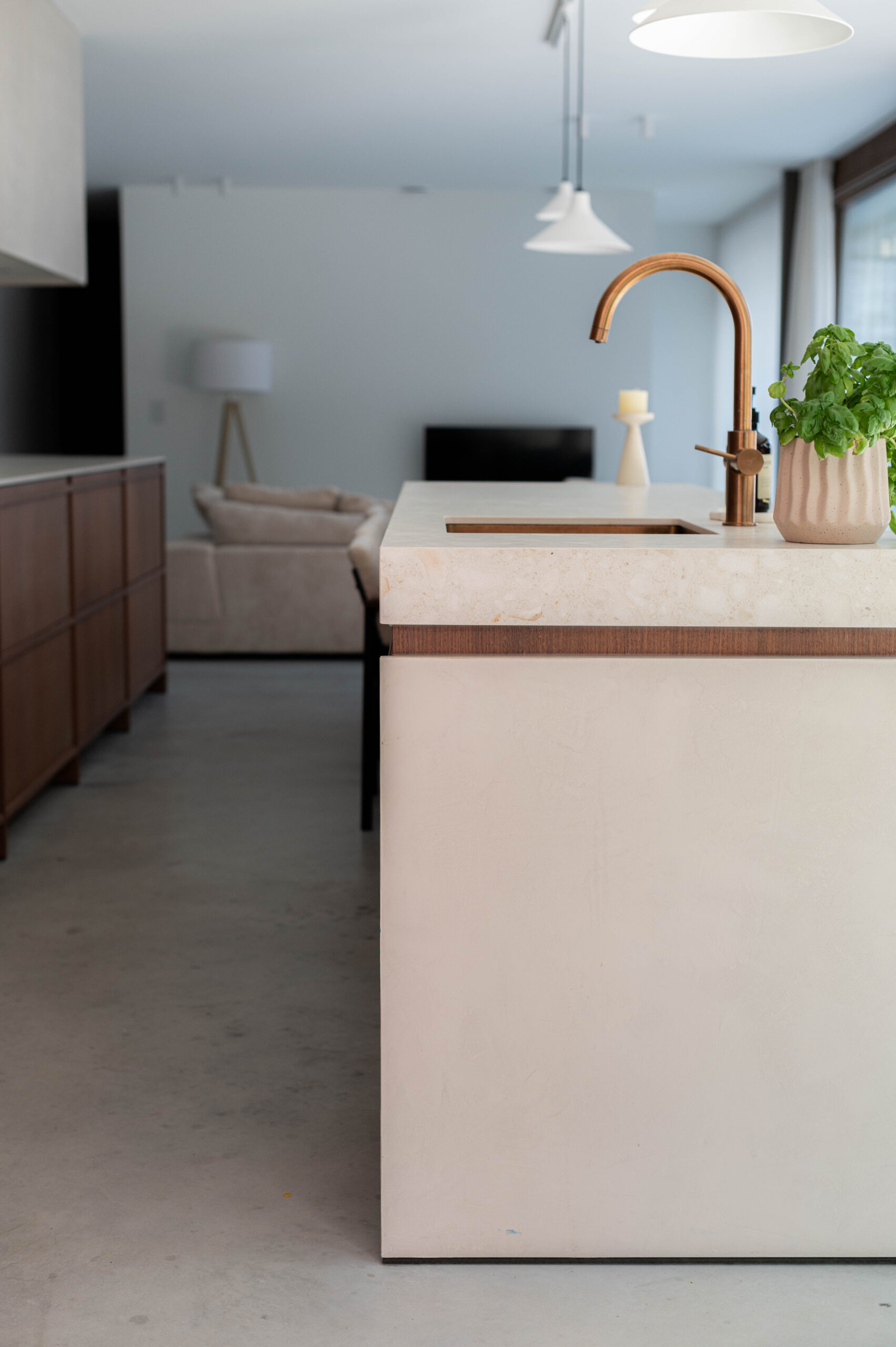 Als een architect vraagt om de keuken van zijn eigen nieuwbouwwoning te realiseren dan weet je al dat het ontwerp en de gekozen materialen “eens iets anders” zijn. We werkten met afrormosia fineer voor de fronten, in combinatie met massief houten grepen en de fronten van de hangkasten in beton ciré van Mineral deco. Het werkblad in keramiek “Retrostone” van Neolith.