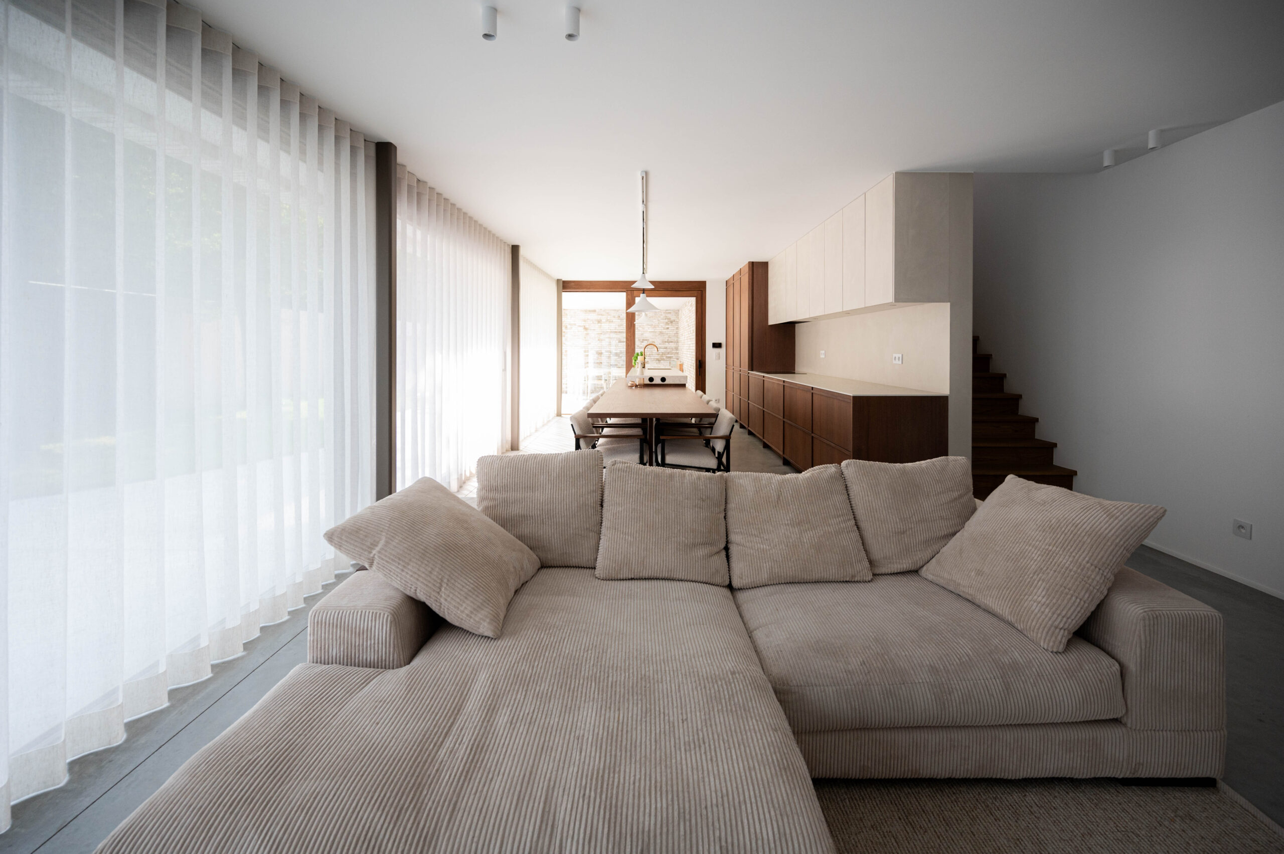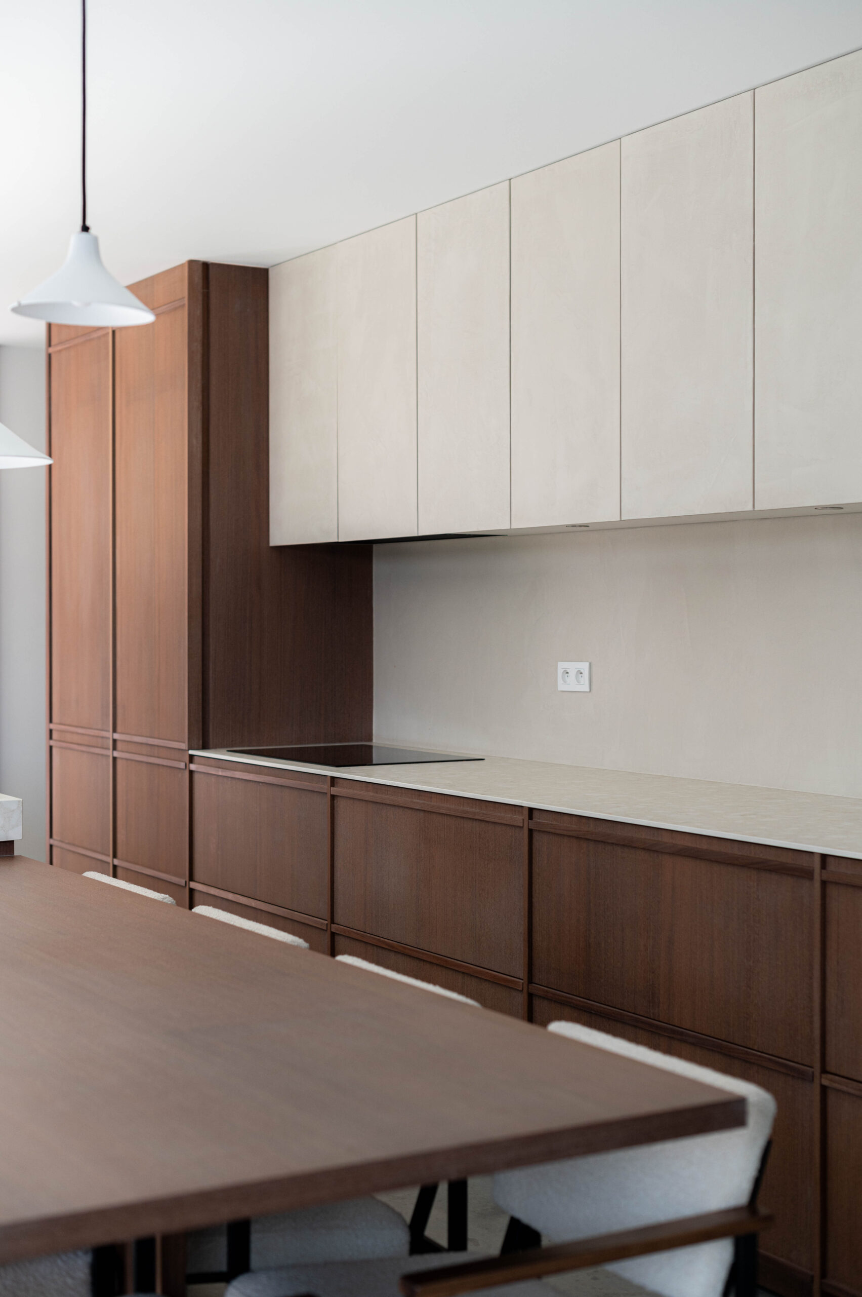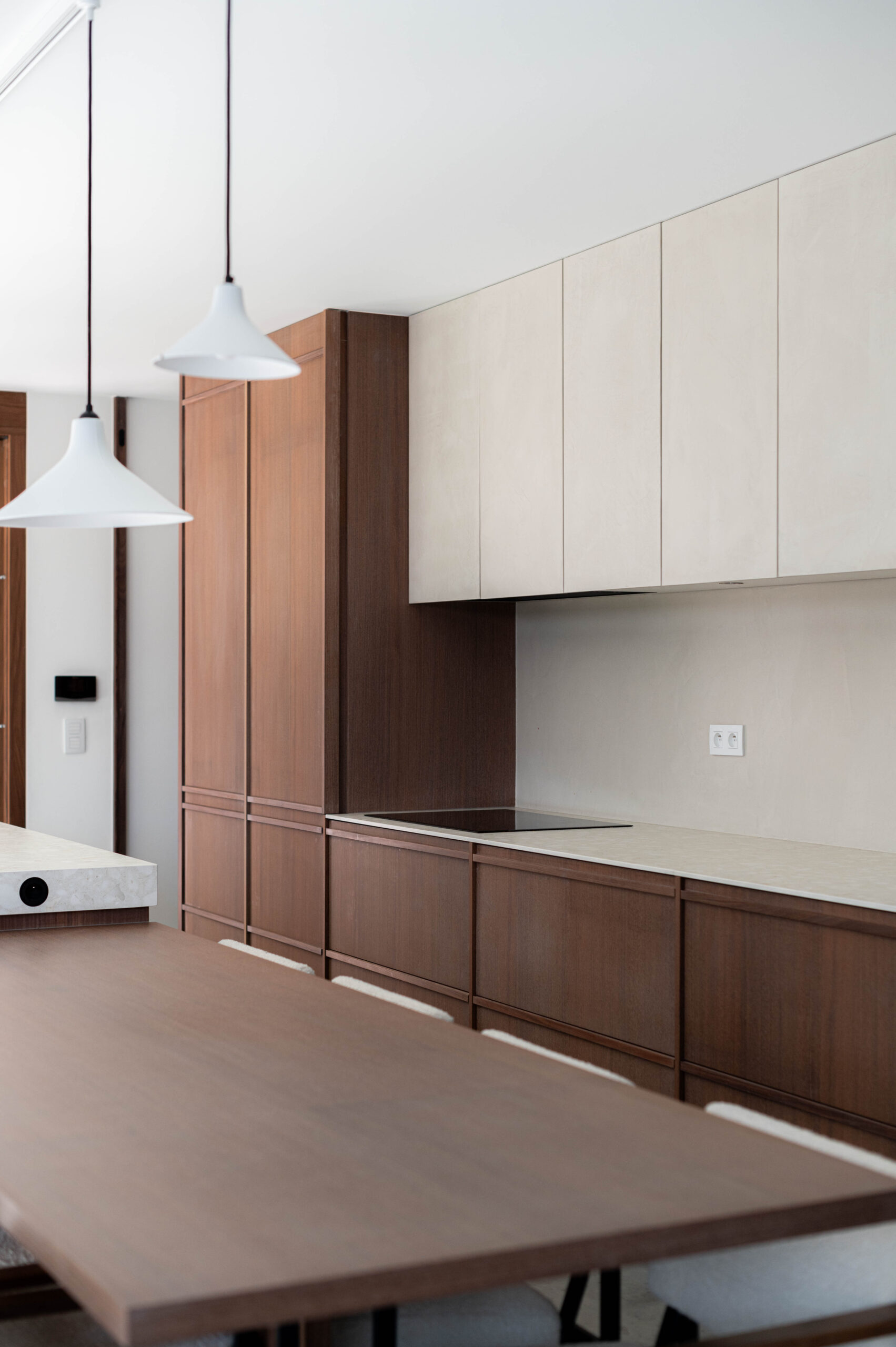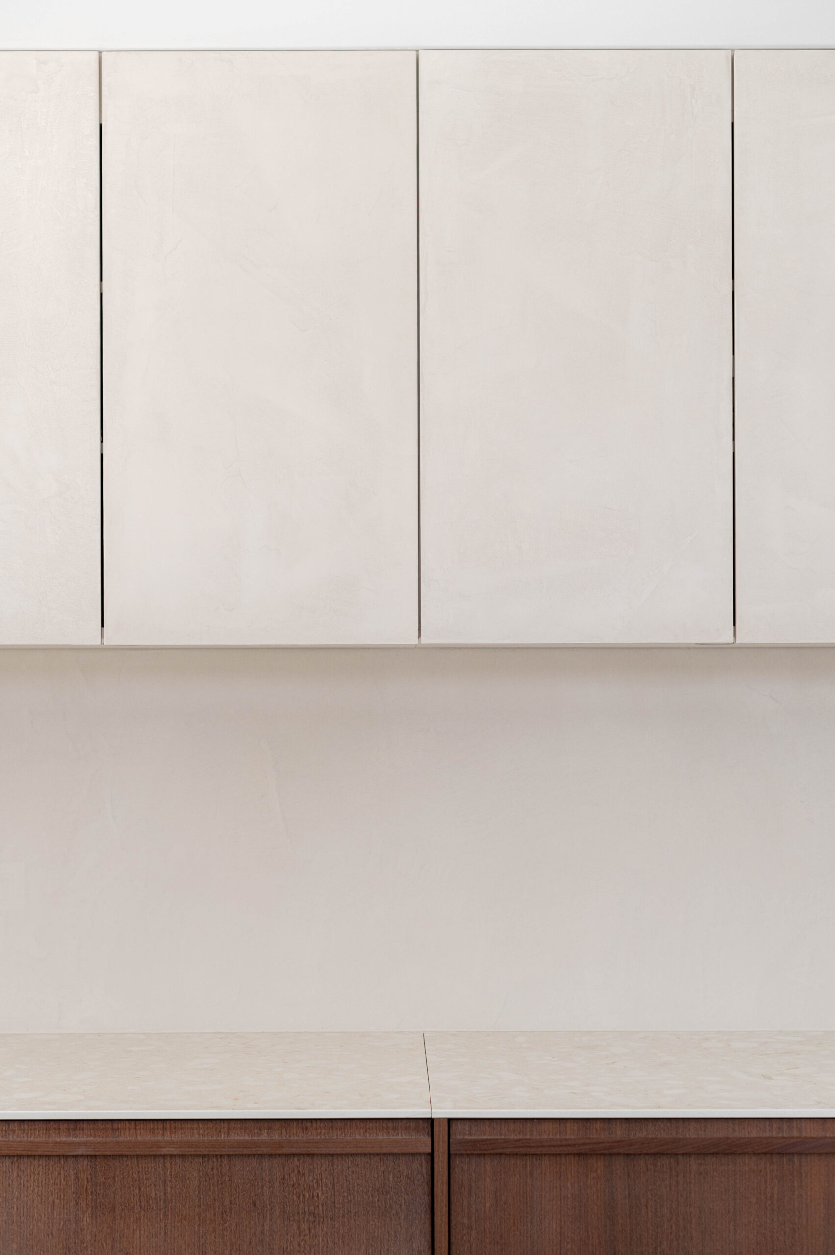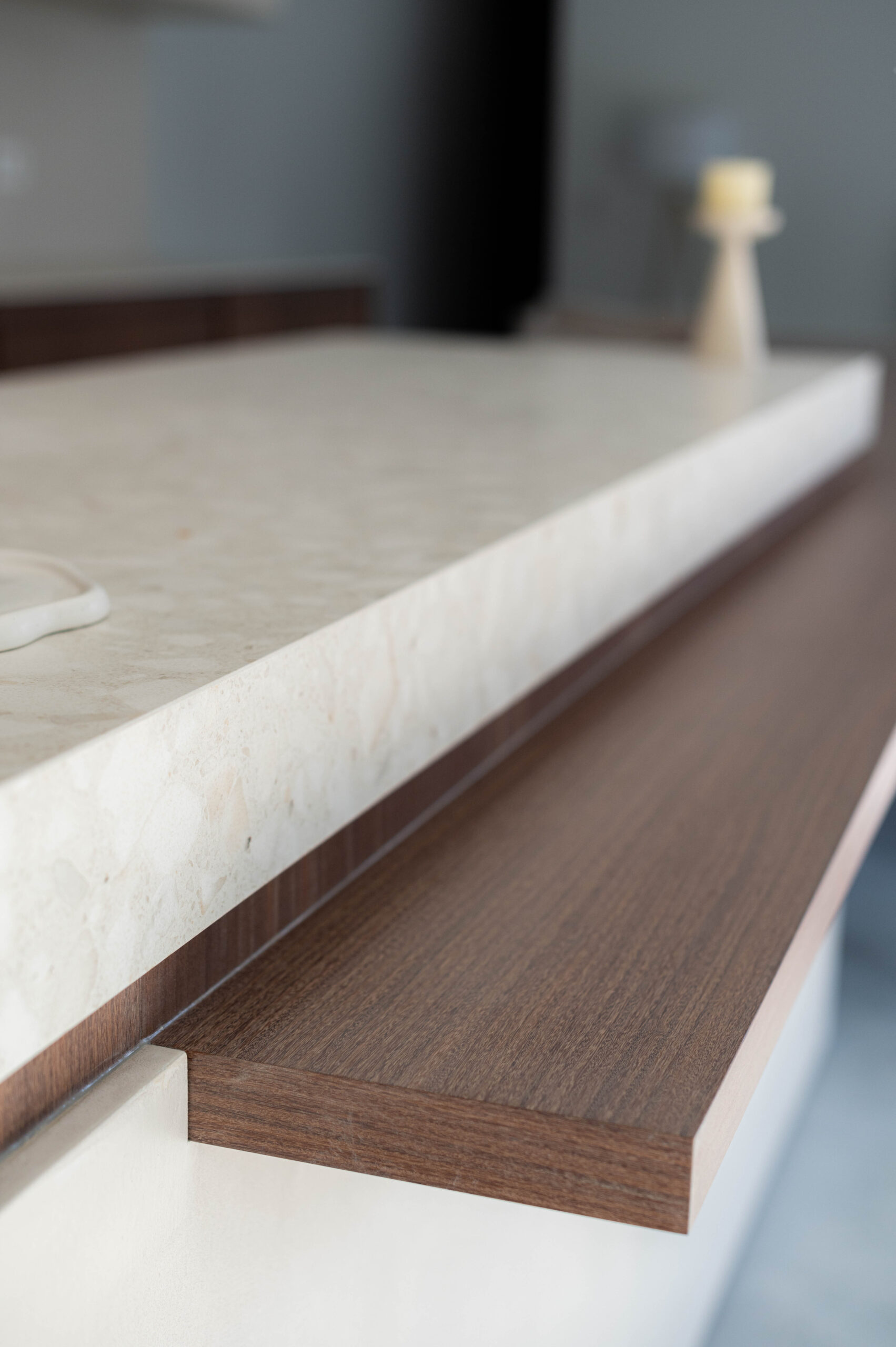 Als een architect vraagt om de keuken van zijn eigen nieuwbouwwoning te realiseren dan weet je al dat het ontwerp en de gekozen materialen “eens iets anders” zijn. We werkten met afrormosia fineer voor de fronten, in combinatie met massief houten grepen en de fronten van de hangkasten in beton ciré van Mineral deco. Het werkblad in keramiek “Retrostone” van Neolith.
