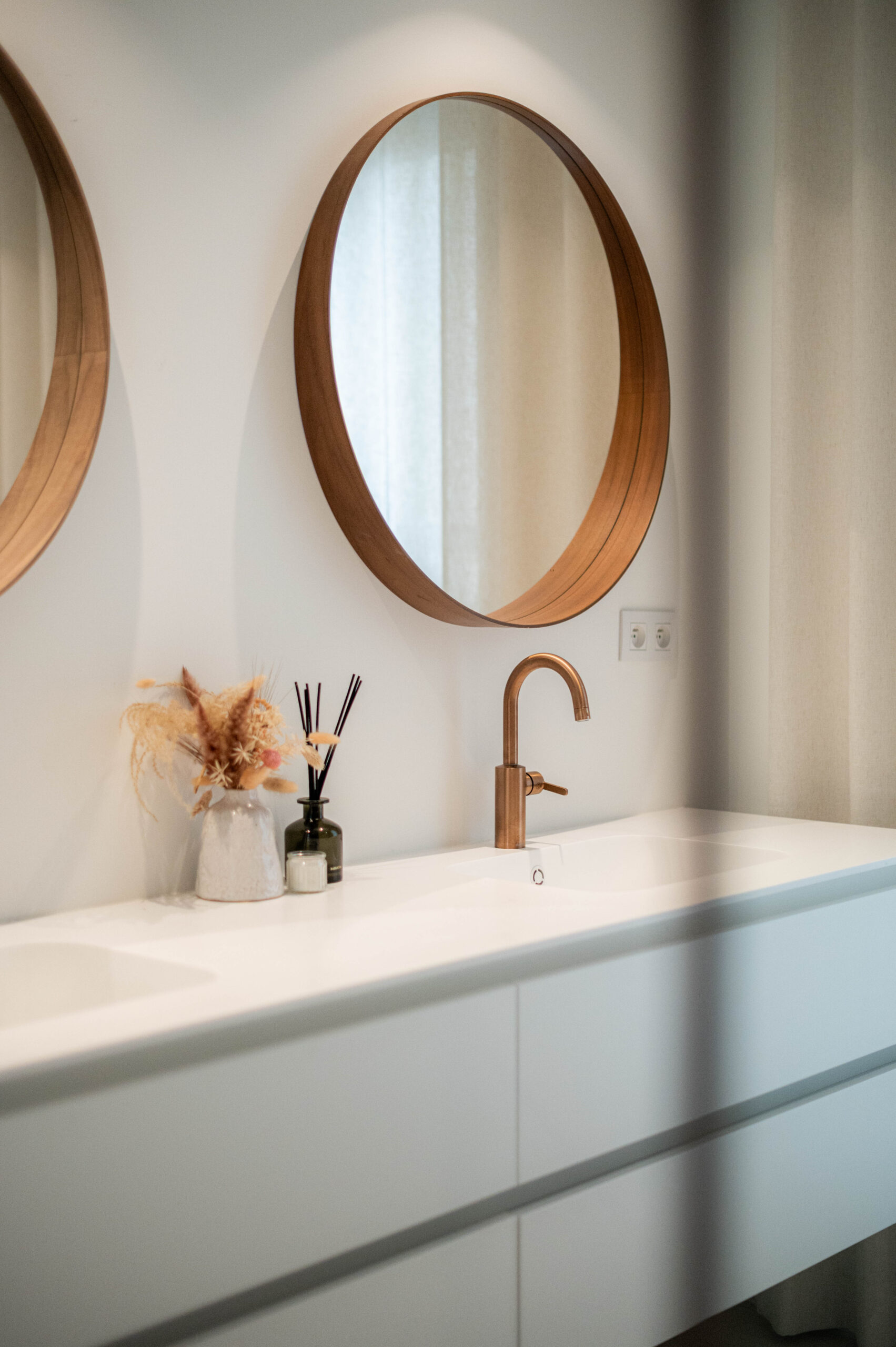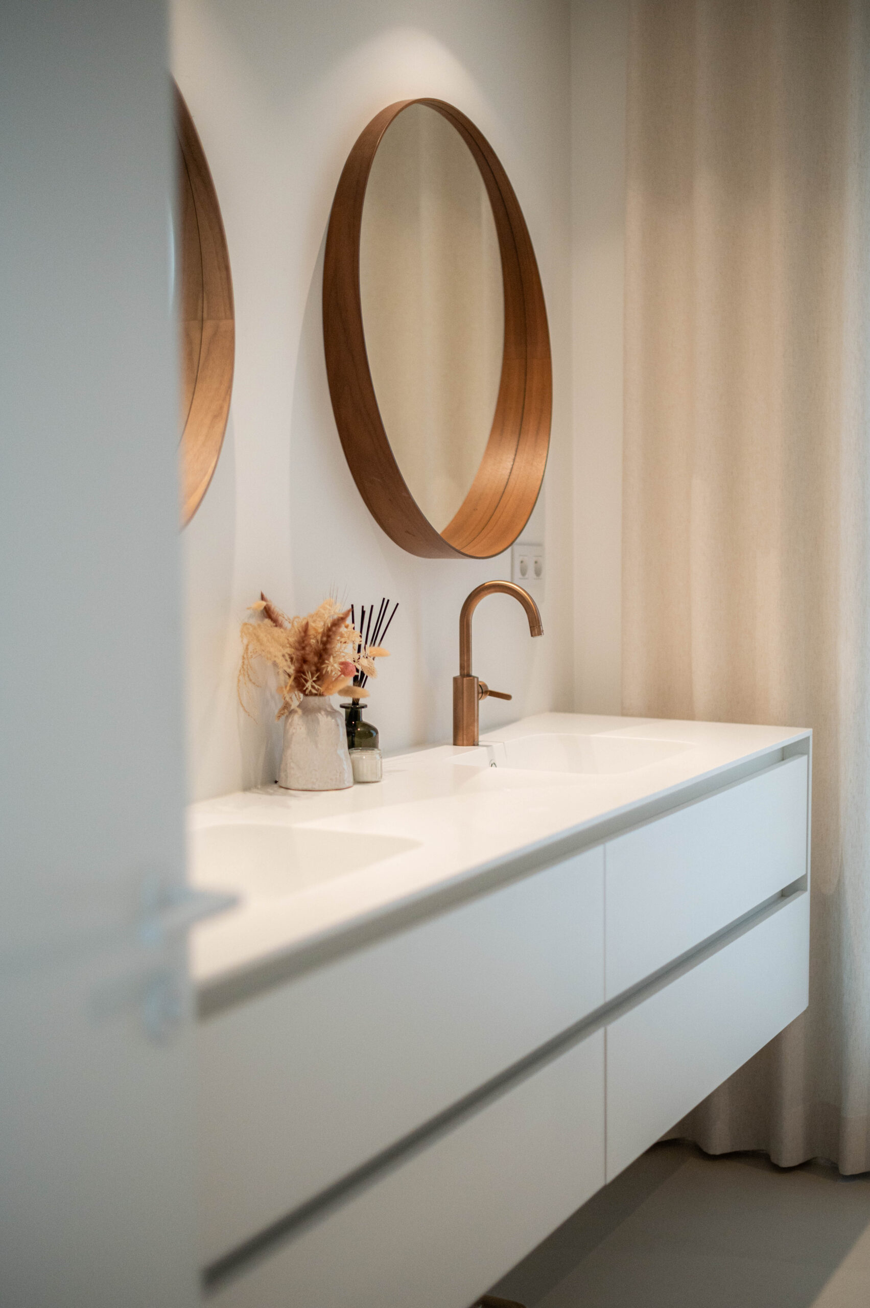 Voor de badkamer valt het meubel op door zijn eenvoud. Corian wasbakken en tablet in combinatie met een hangmeubel in wit HPL is altijd een winnaar!