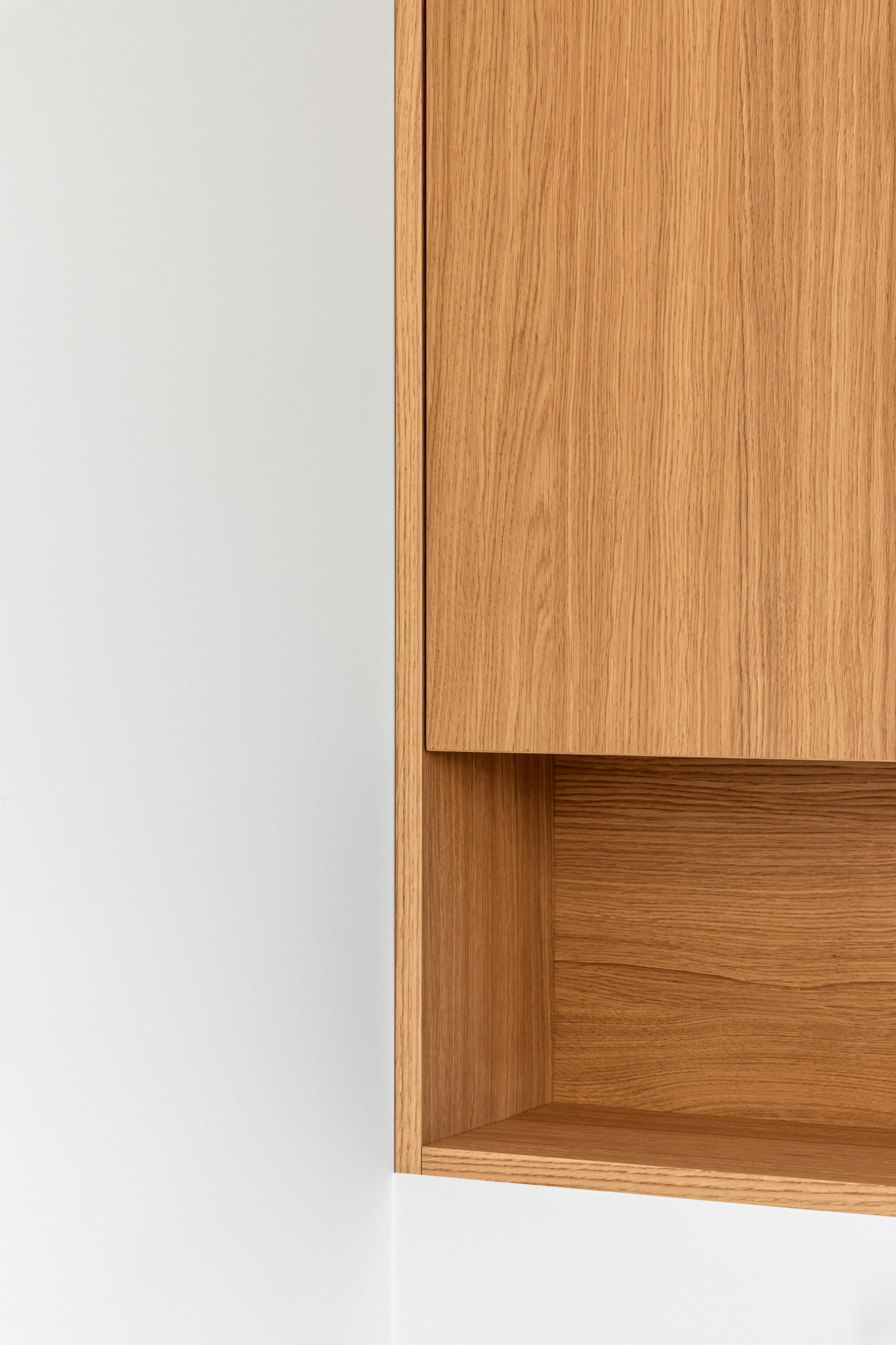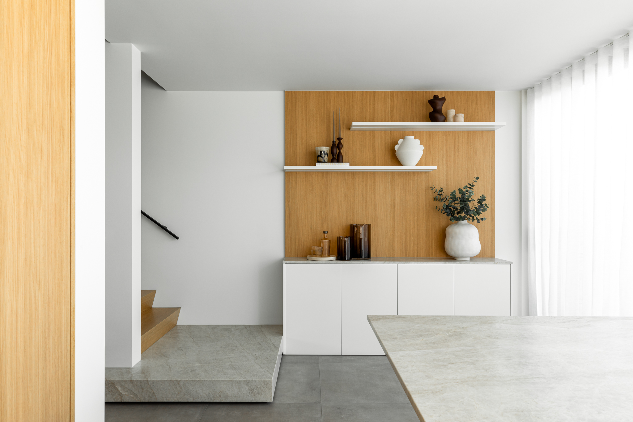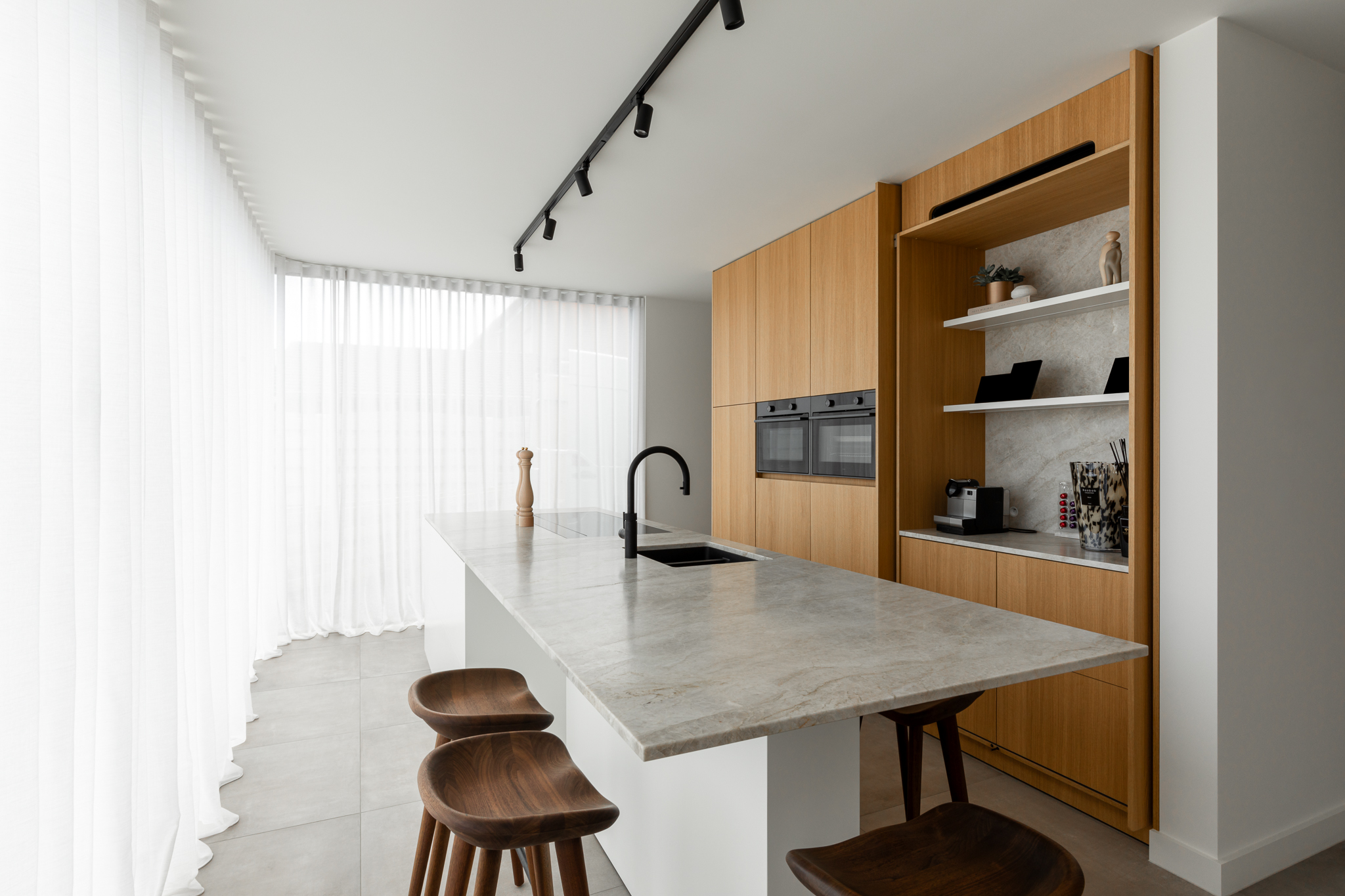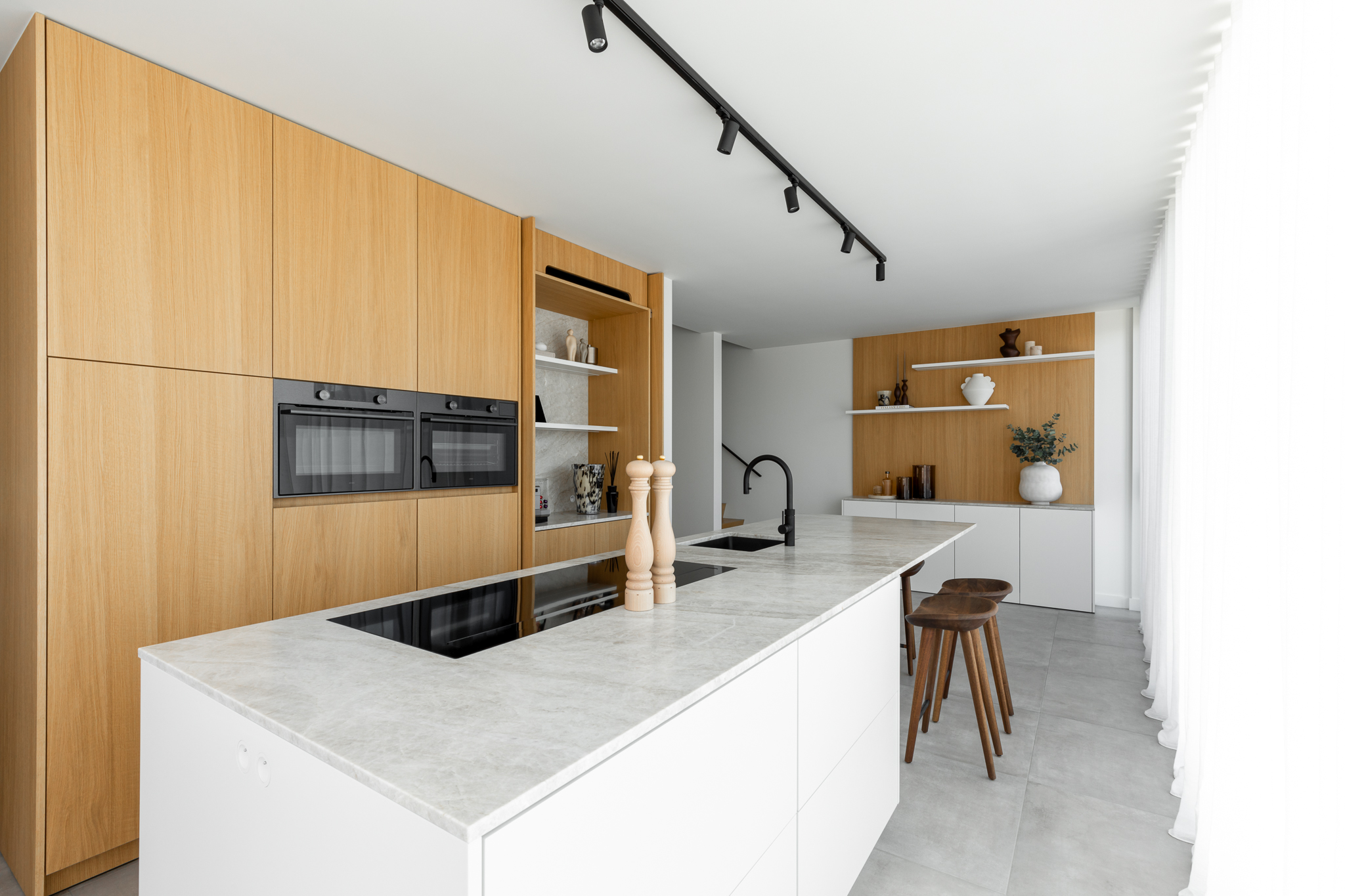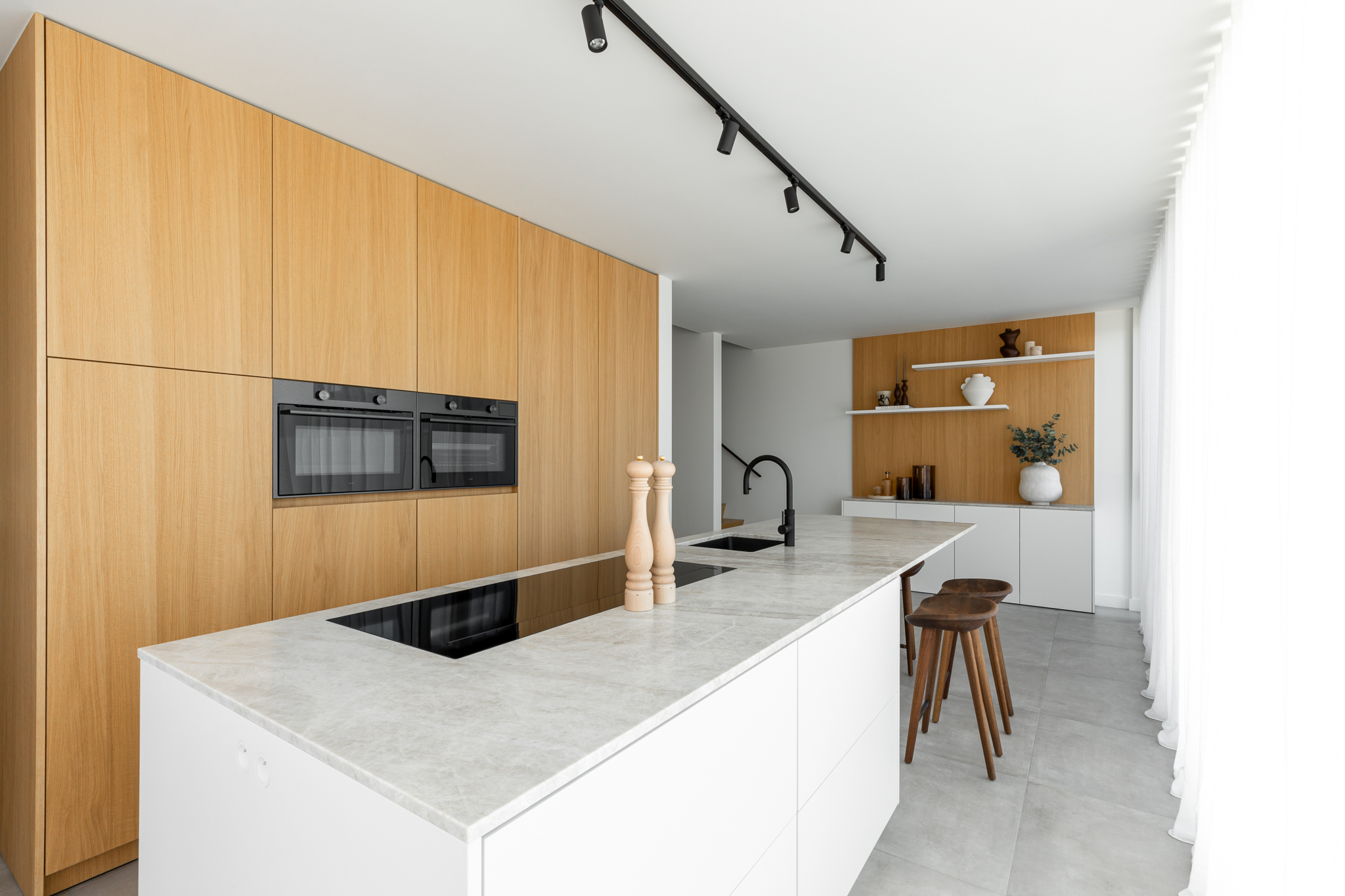 In deze woning werd het volledige interieur ontworpen door interieurarchitecte Christel Goossens. De klant koos voor prachtige, tijdloze materialen die doorheen de gehele woning werden doorgetrokken. De eik fineer voorzien van naturelle vernis, in combinatie met wit lakwerk geeft een strak maar warm geheel.