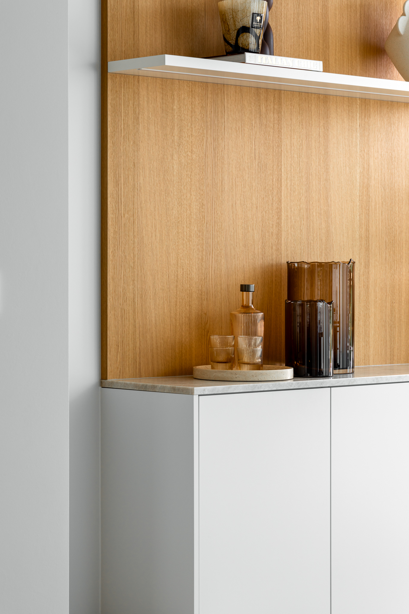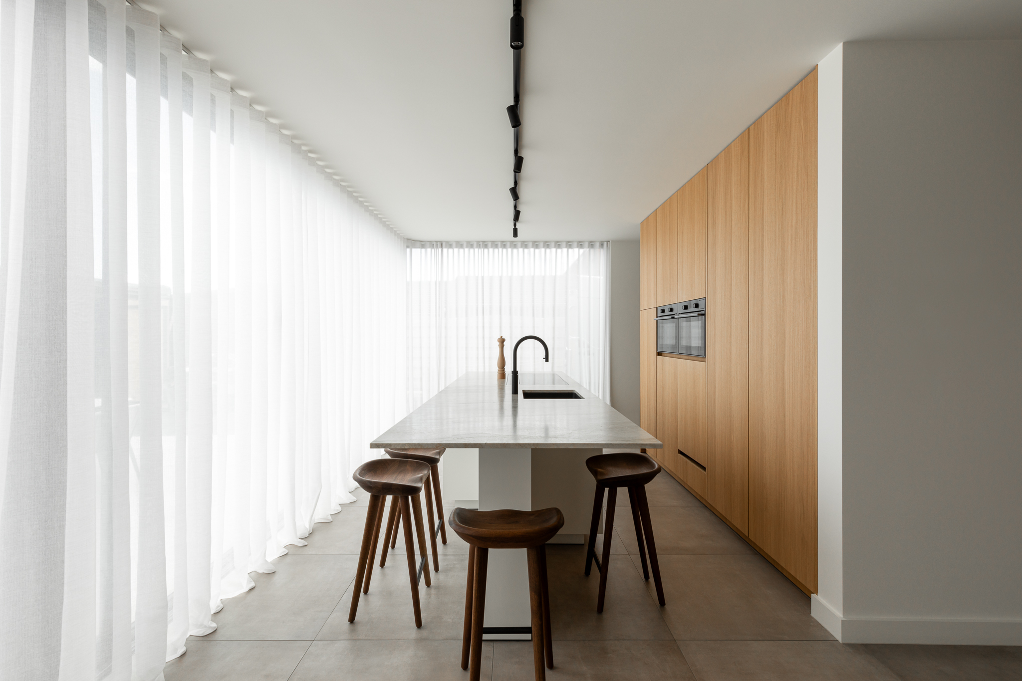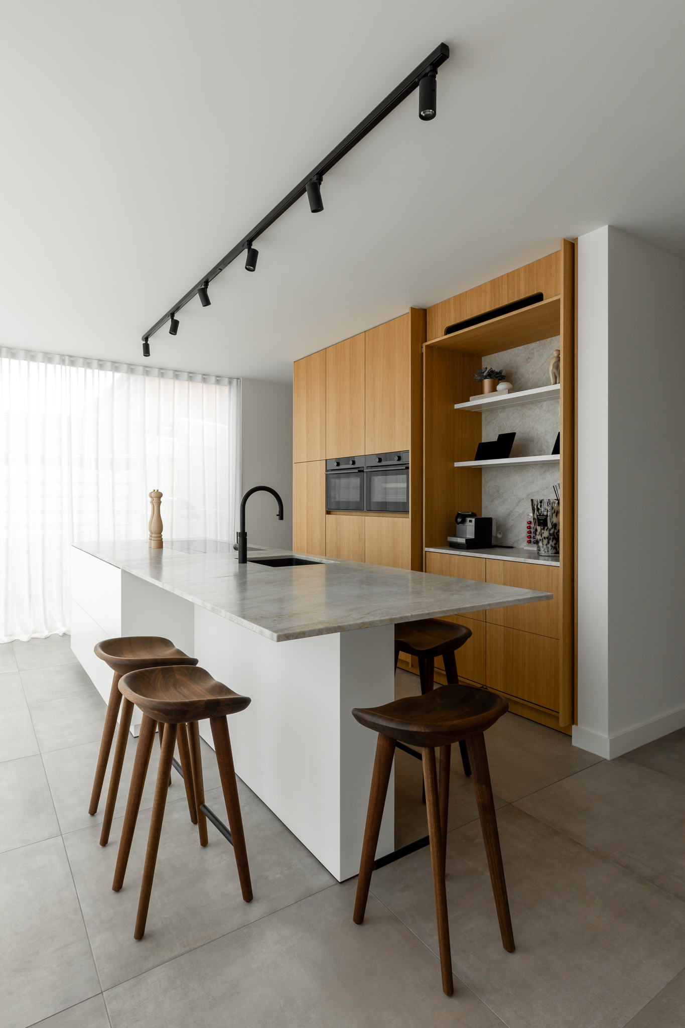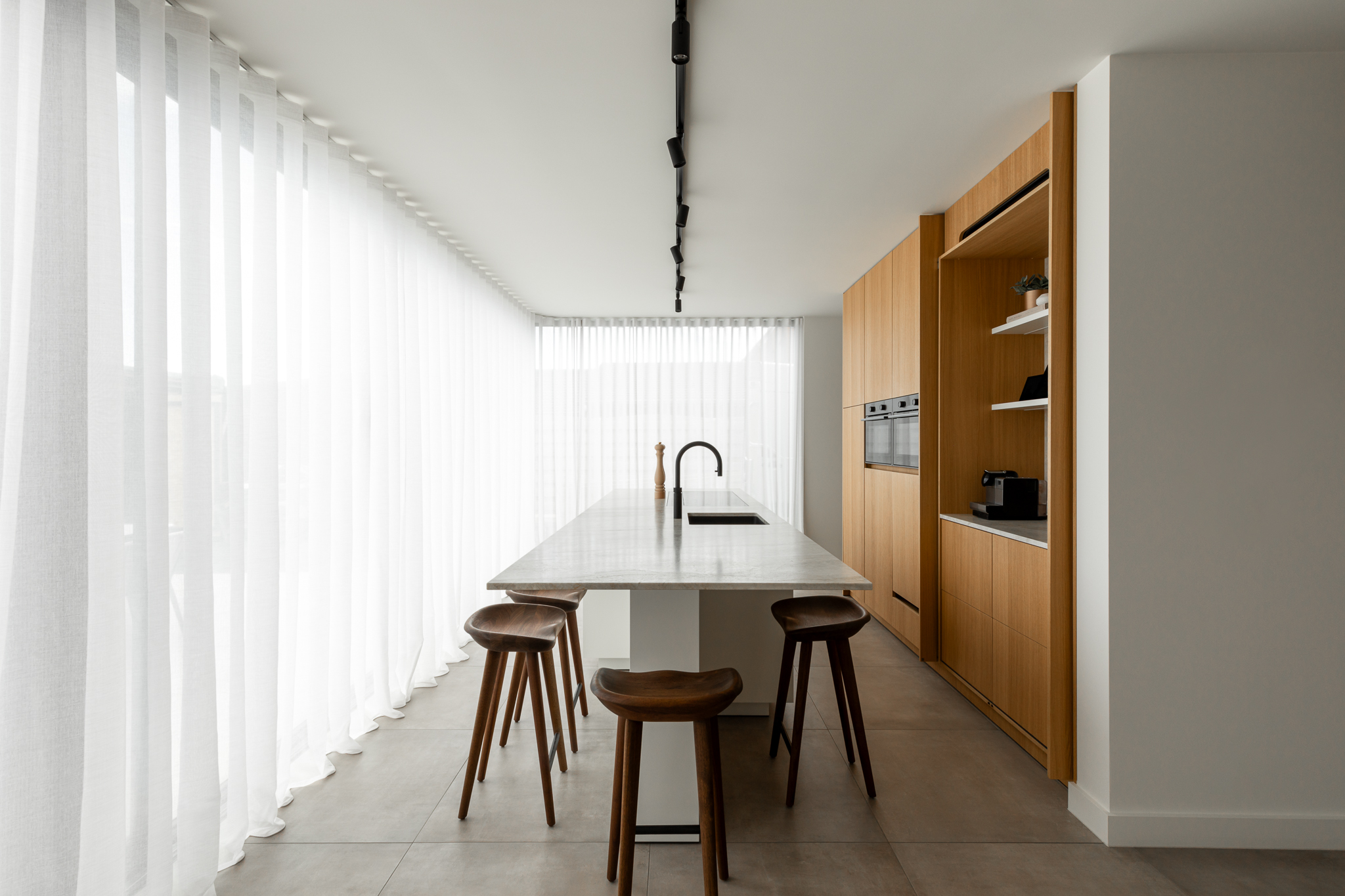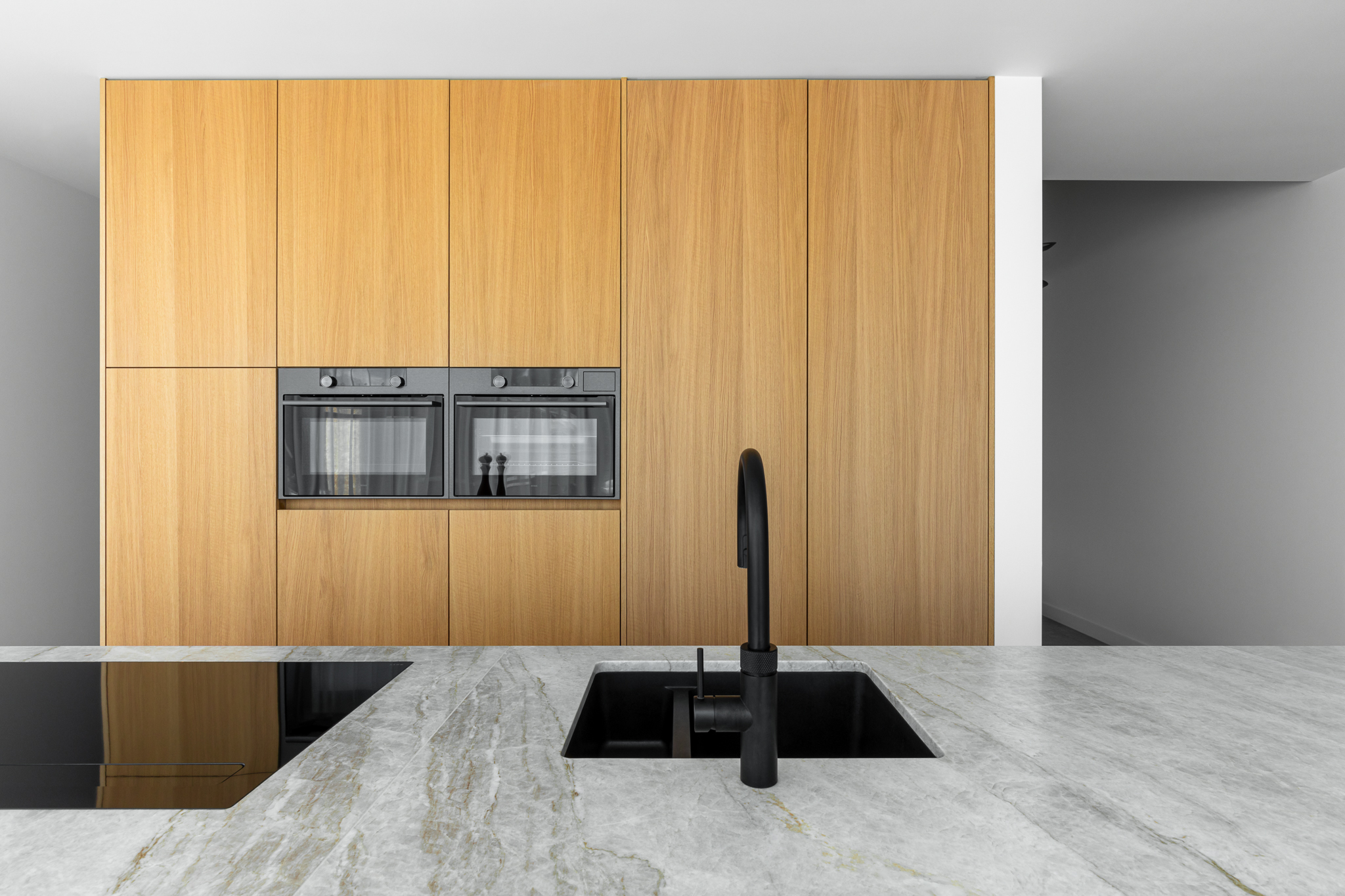 In deze woning werd het volledige interieur ontworpen door interieurarchitecte Christel Goossens. De klant koos voor prachtige, tijdloze materialen die doorheen de gehele woning werden doorgetrokken. De eik fineer voorzien van naturelle vernis, in combinatie met wit lakwerk geeft een strak maar warm geheel.