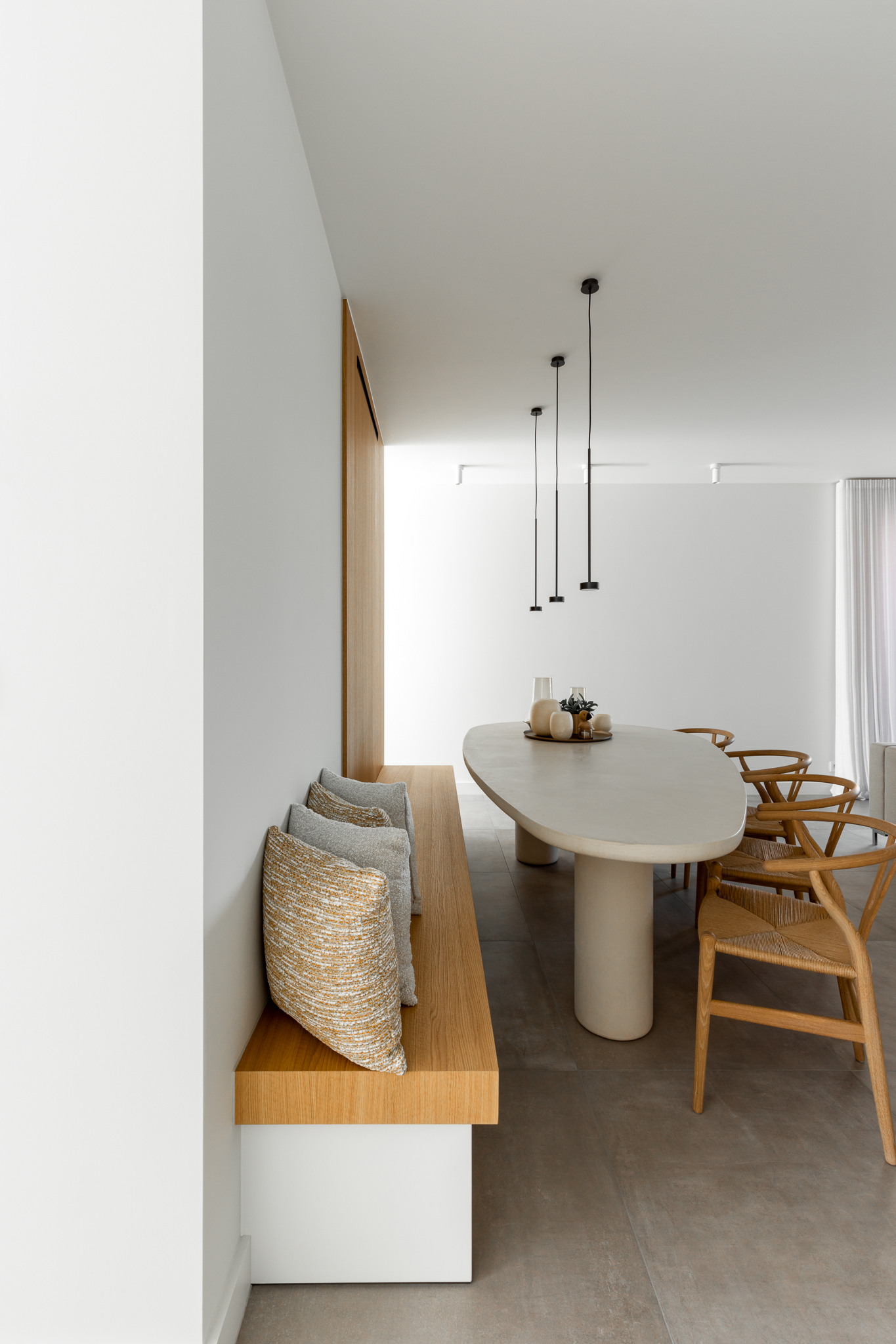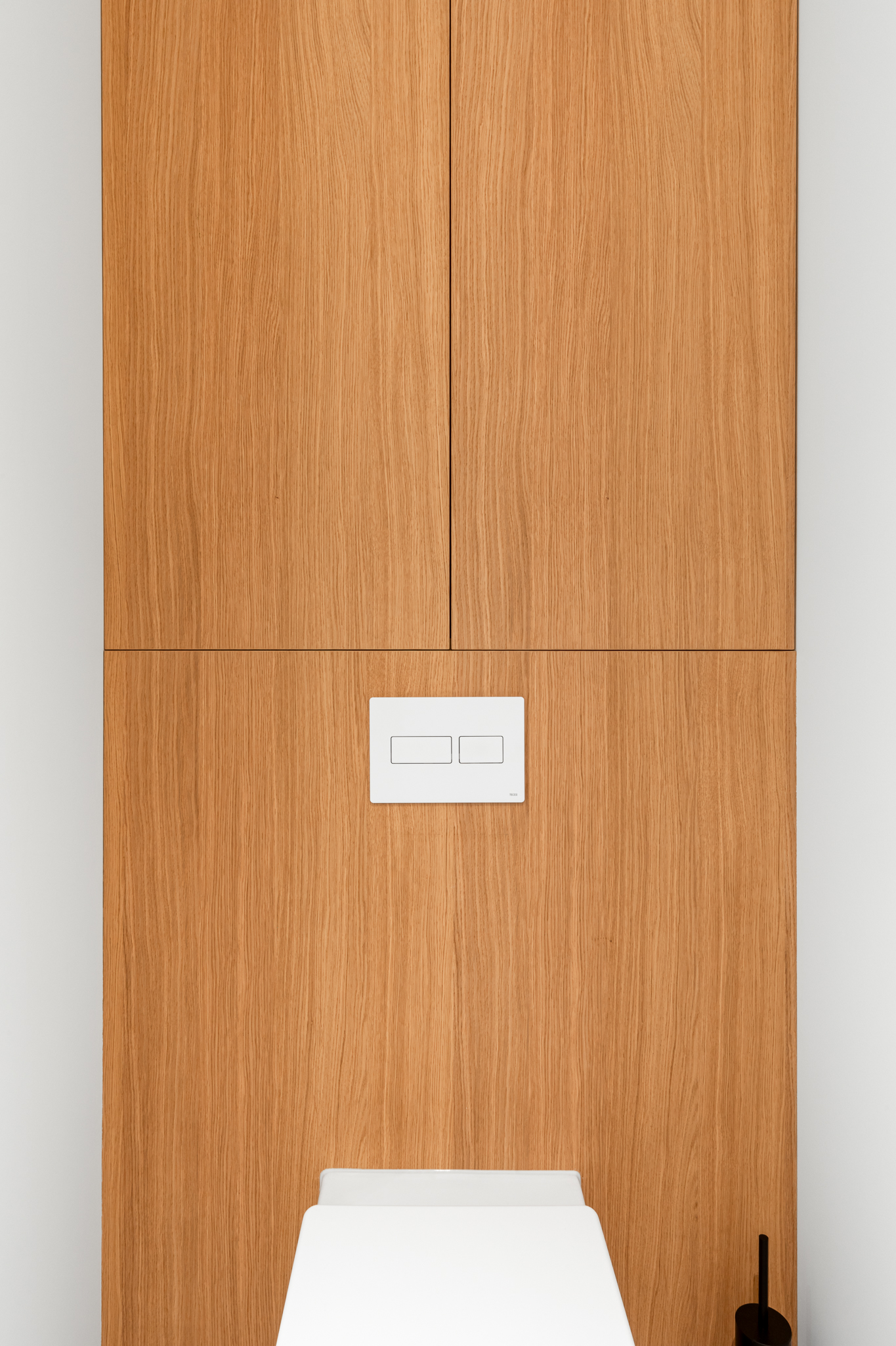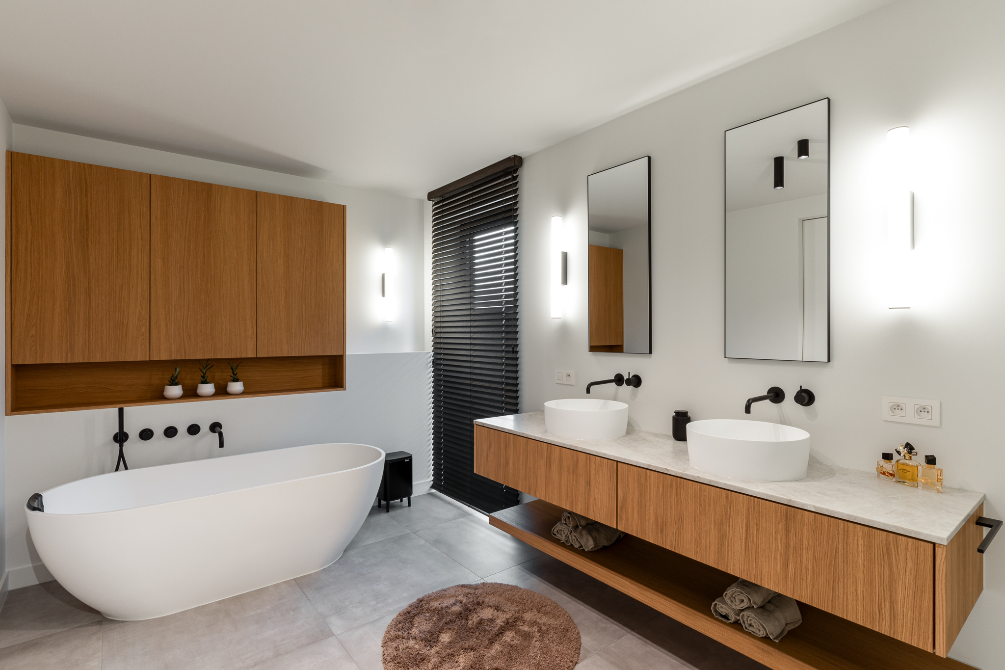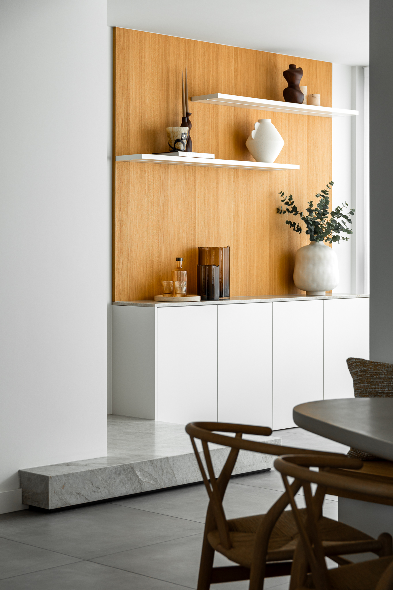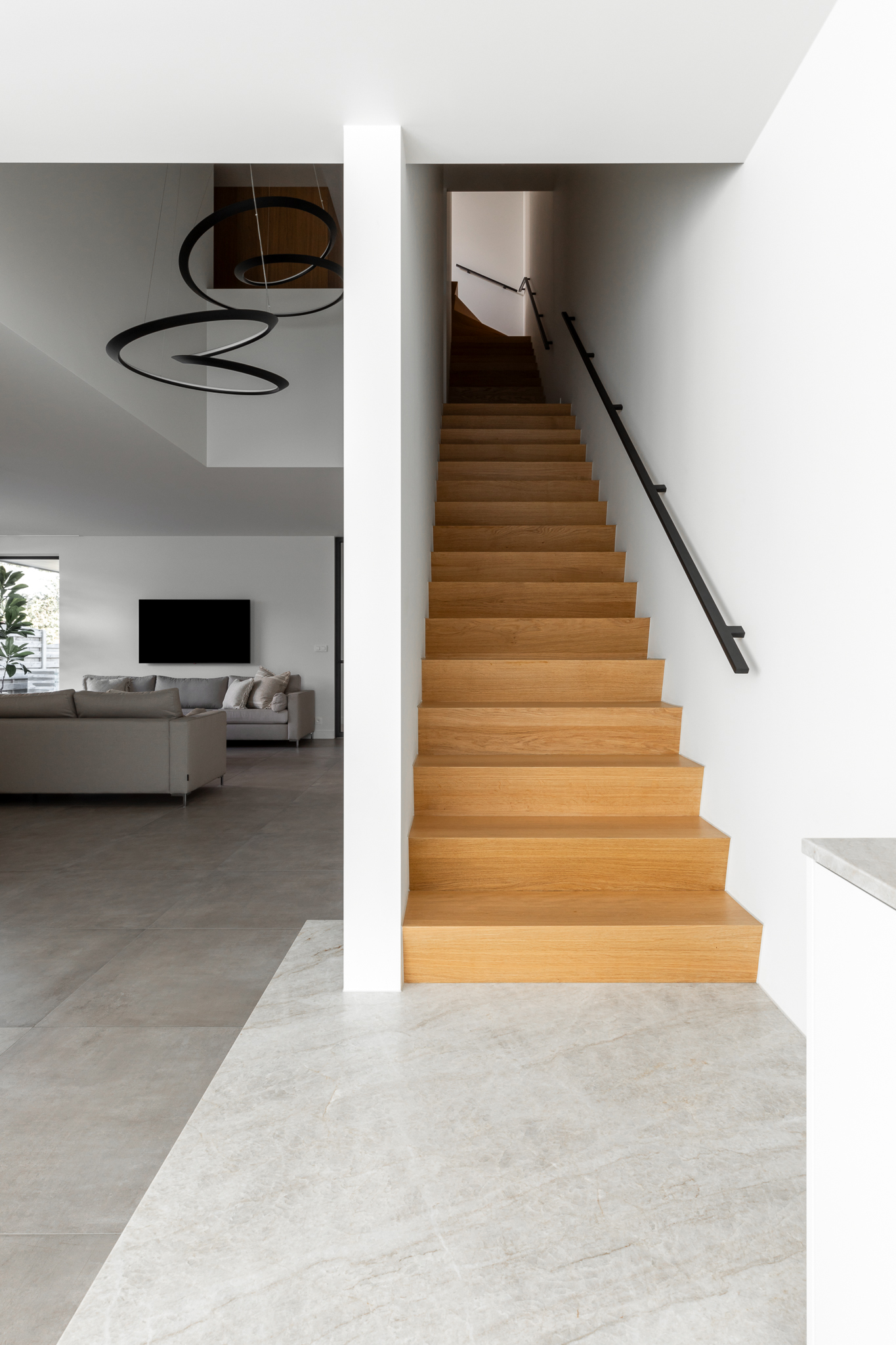 In deze woning werd het volledige interieur ontworpen door interieurarchitecte Christel Goossens. De klant koos voor prachtige, tijdloze materialen die doorheen de gehele woning werden doorgetrokken. De eik fineer voorzien van naturelle vernis, in combinatie met wit lakwerk geeft een strak maar warm geheel.