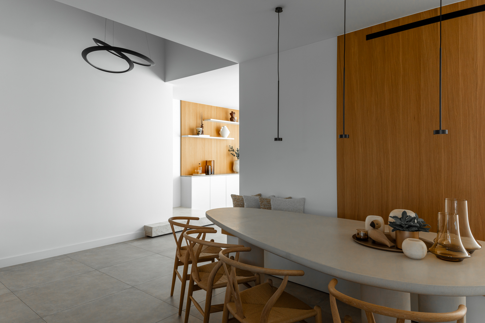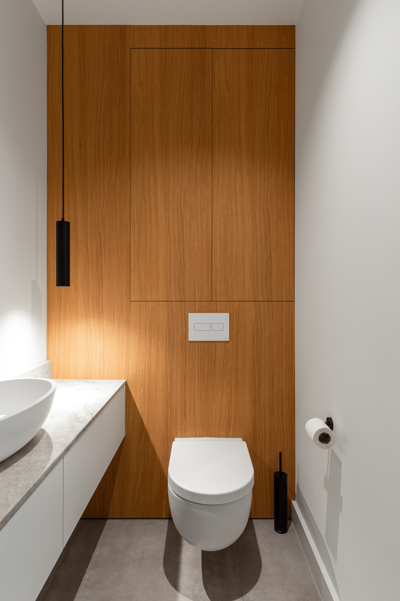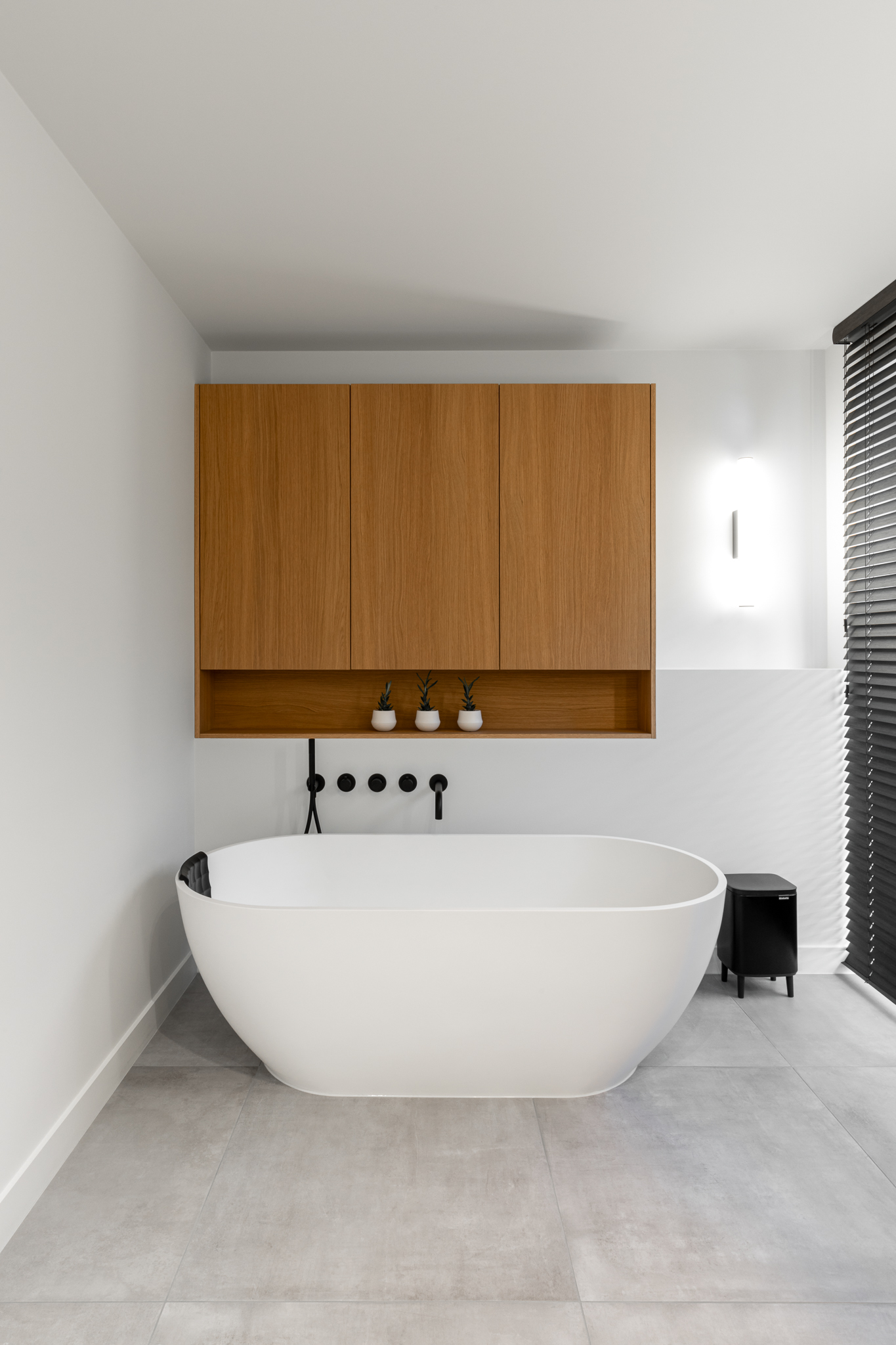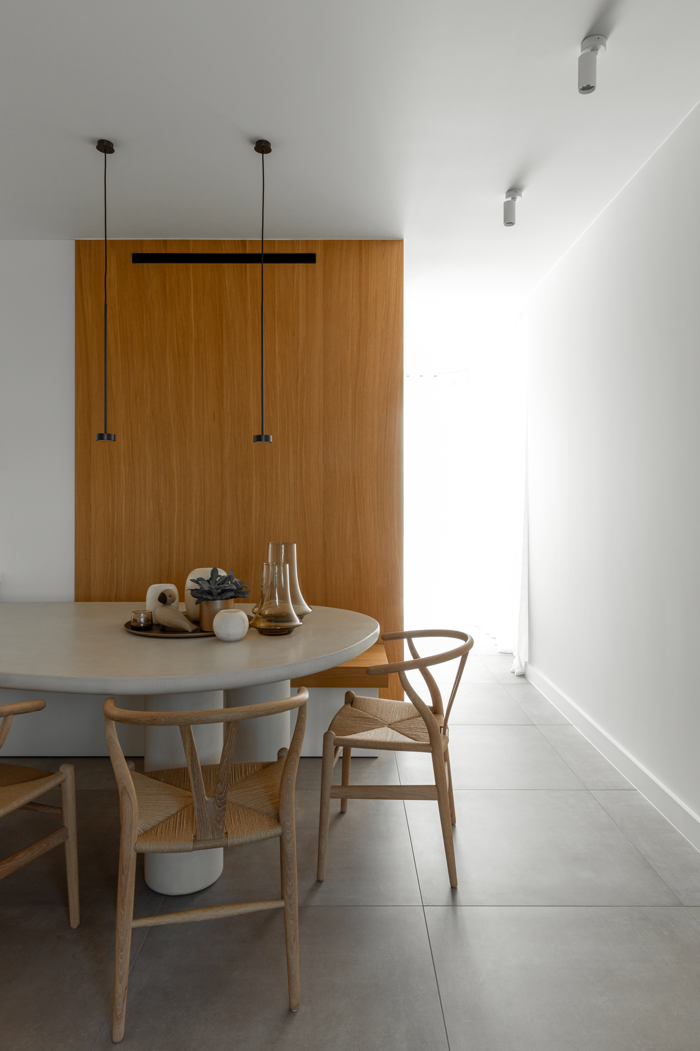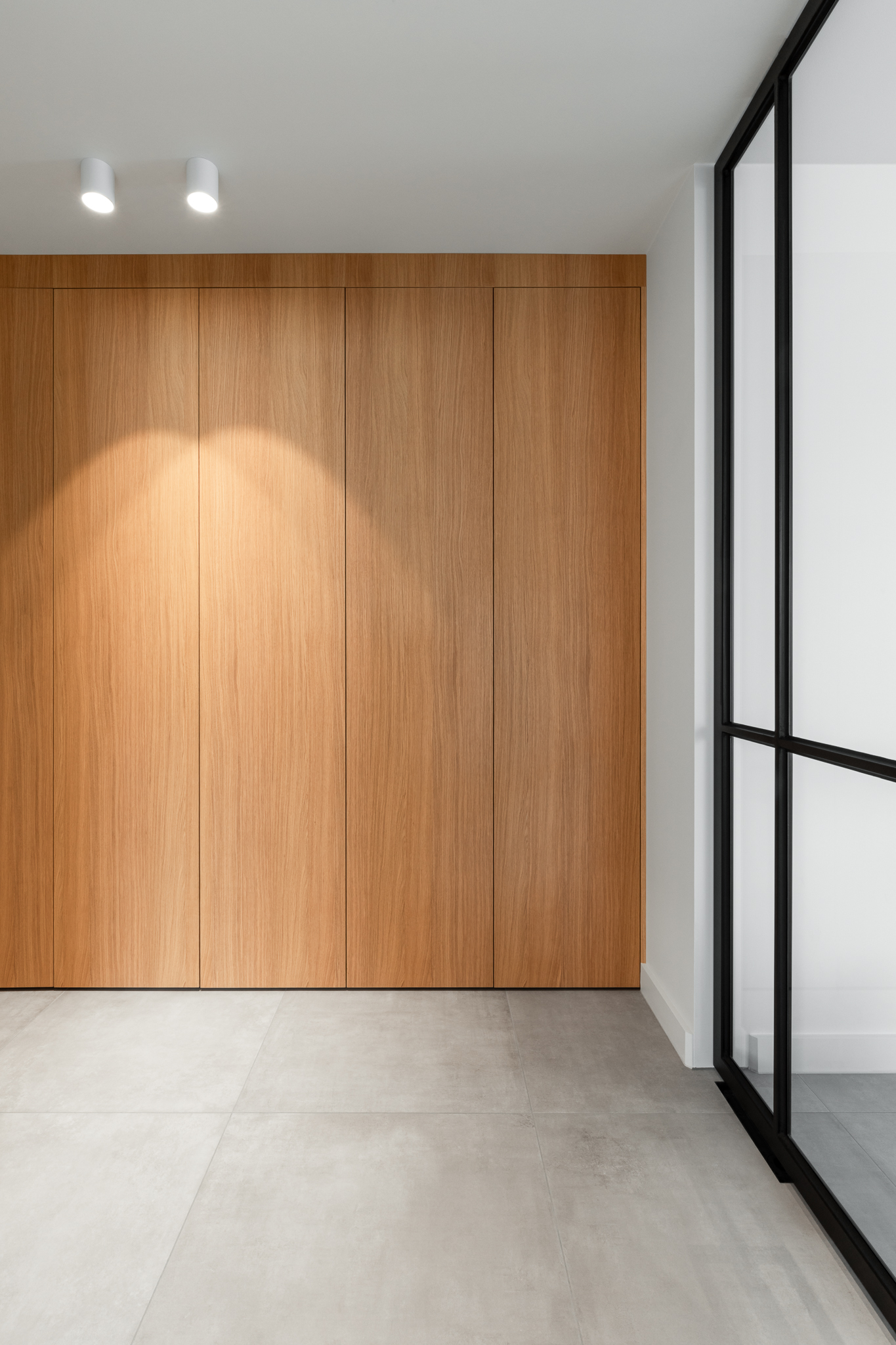 In deze woning werd het volledige interieur ontworpen door interieurarchitecte Christel Goossens. De klant koos voor prachtige, tijdloze materialen die doorheen de gehele woning werden doorgetrokken. De eik fineer voorzien van naturelle vernis, in combinatie met wit lakwerk geeft een strak maar warm geheel.