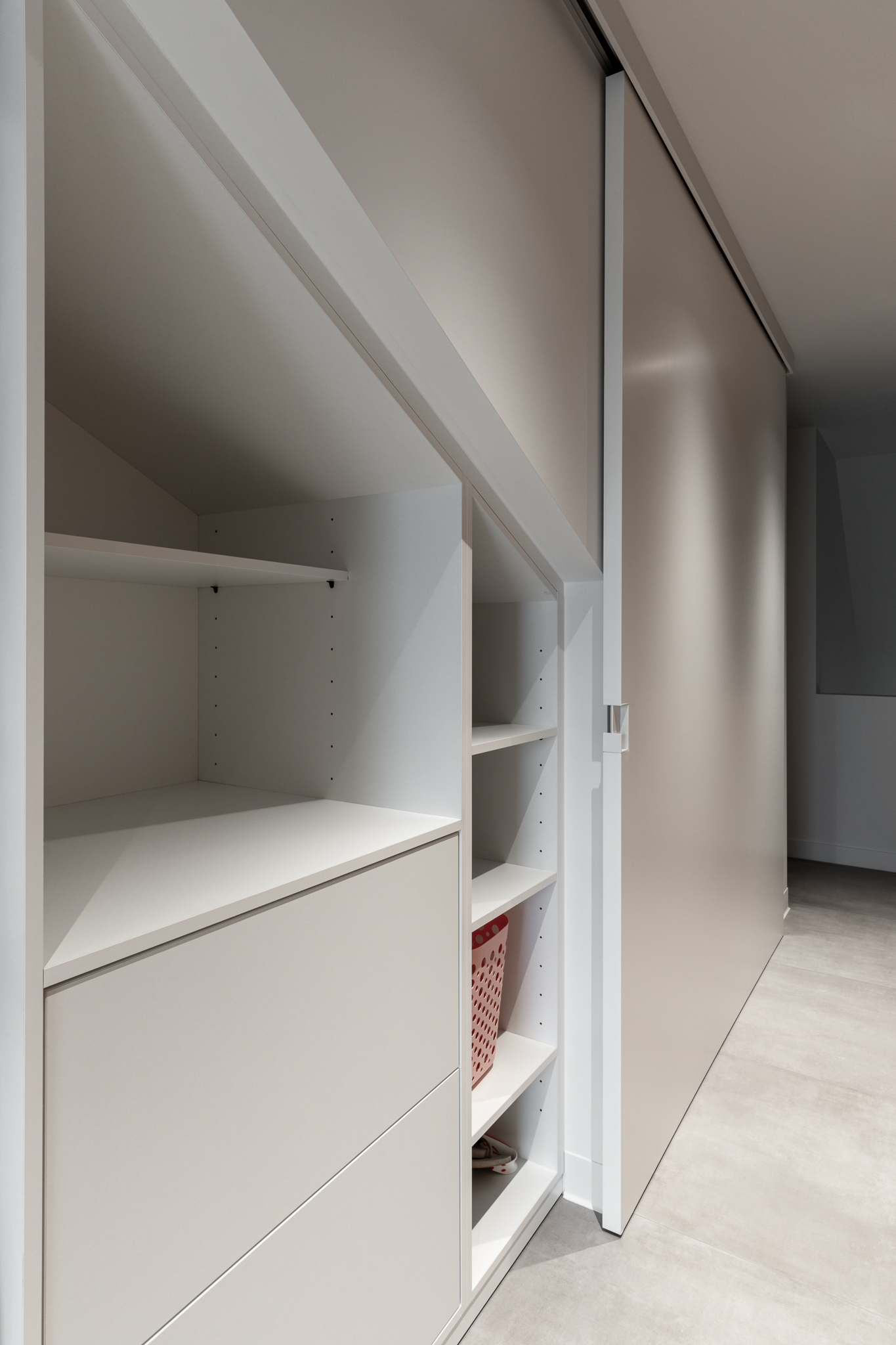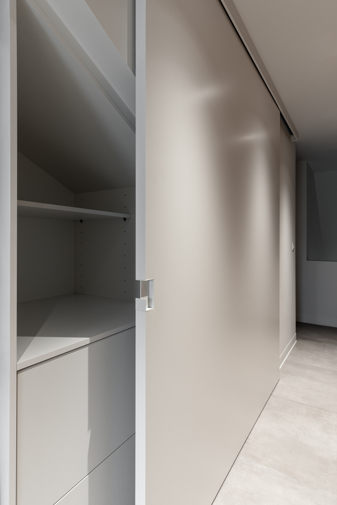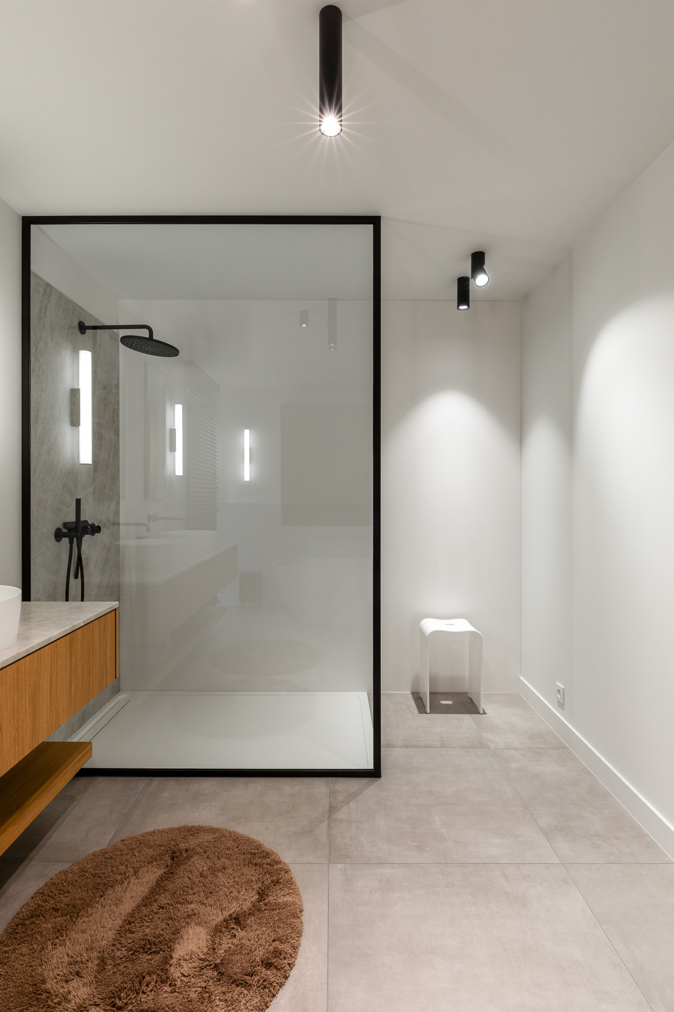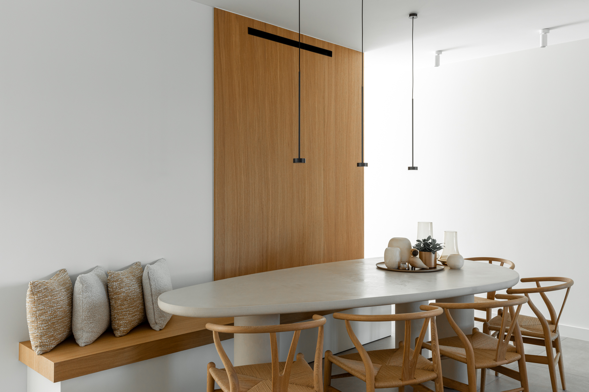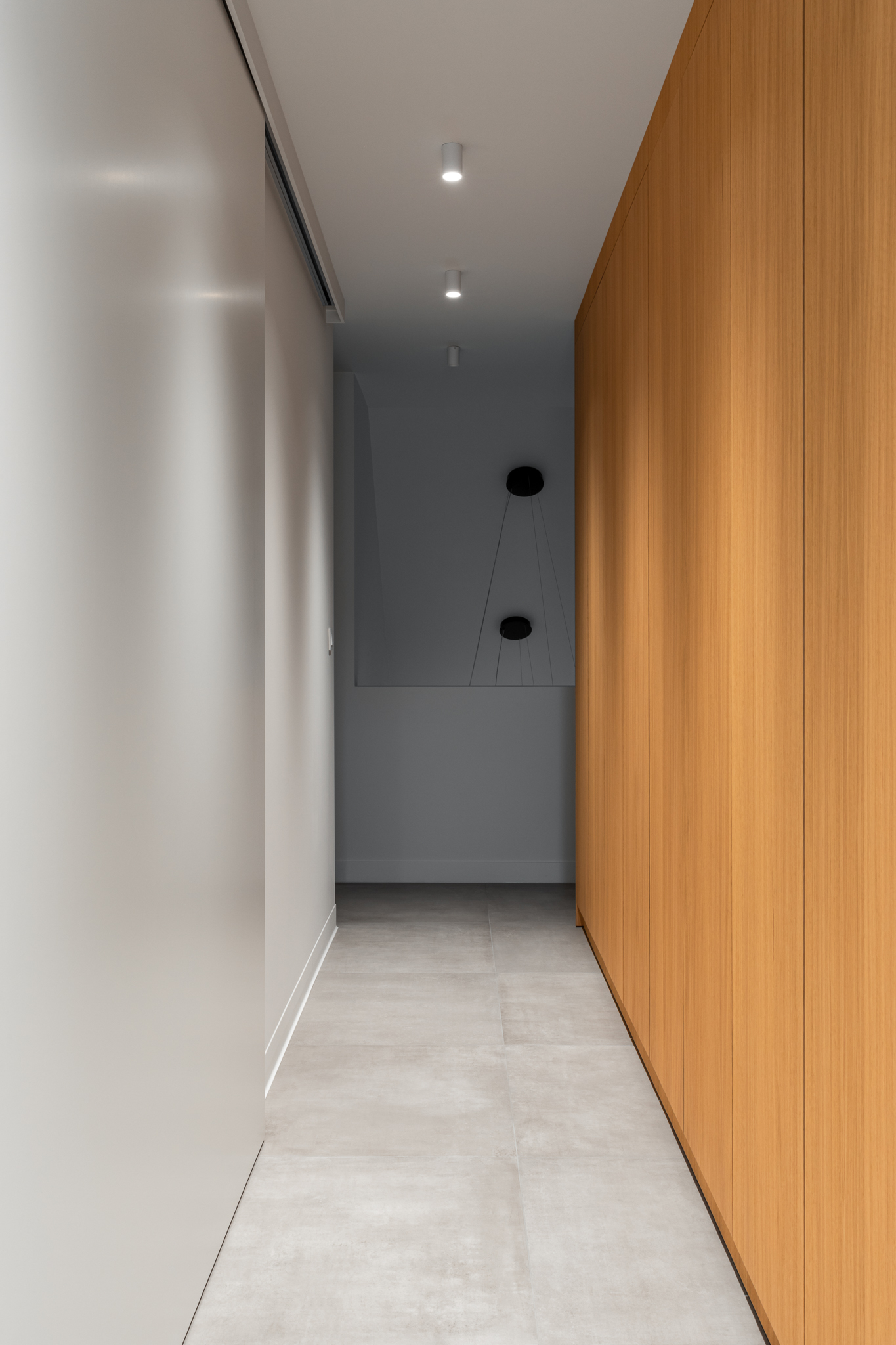 In deze woning werd het volledige interieur ontworpen door interieurarchitecte Christel Goossens. De klant koos voor prachtige, tijdloze materialen die doorheen de gehele woning werden doorgetrokken. De eik fineer voorzien van naturelle vernis, in combinatie met wit lakwerk geeft een strak maar warm geheel.
