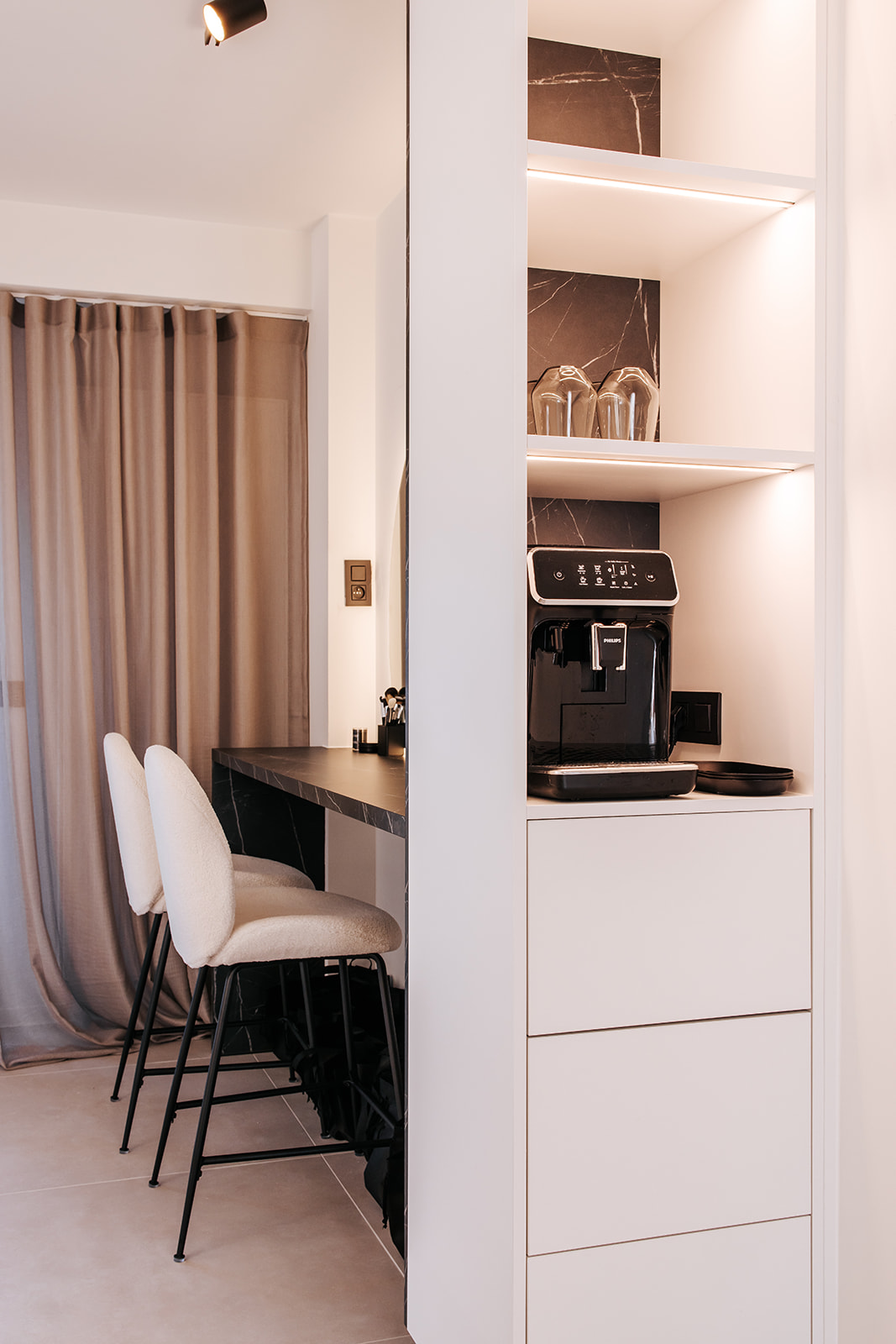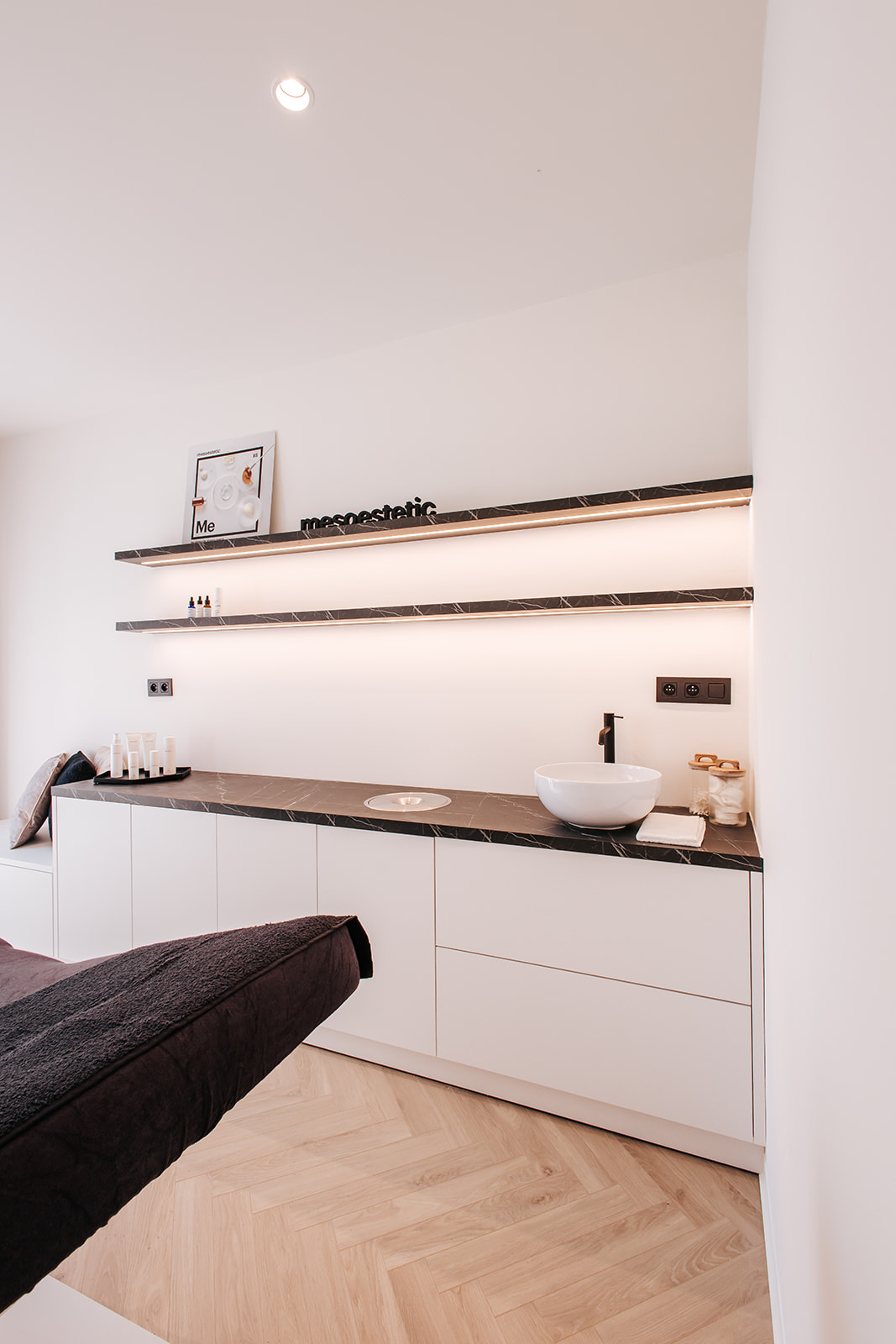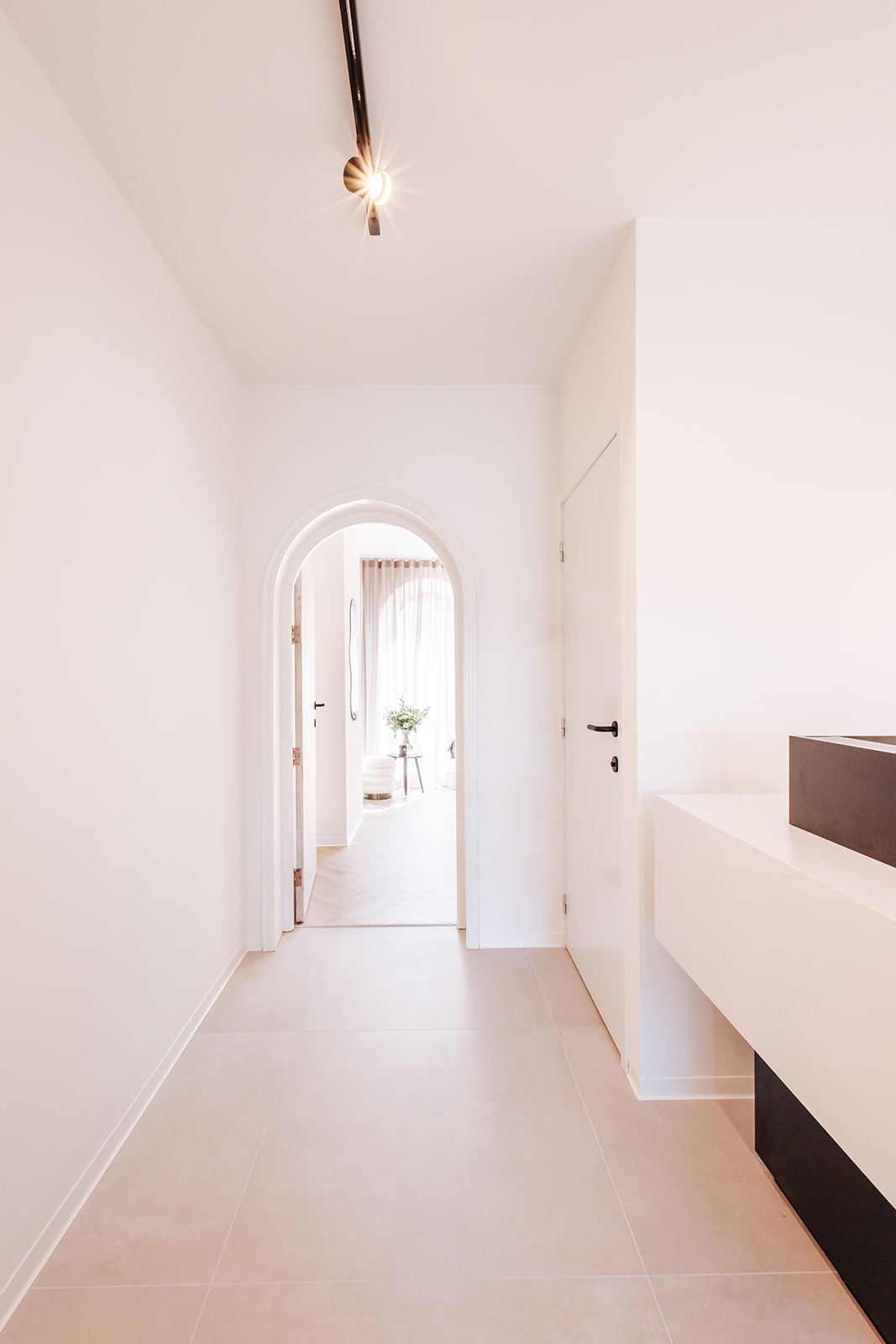 Voor dit project gingen we ALL IN! We mochten de volledige renovatie van het gelijkvloers voor onze rekening nemen en toverden zo een bestaande woning om naar een pand waar wonen én werken mogelijk worden. We realiseerden de ruimte waar Amaury haar klanten optimaal tot rust kan laten komen. In de woongelegenheid werden verschillende ruimtes gecreëerd, waaronder badkamer, slaapkamer met dressing, kinderkamer, keuken en woonkamer.